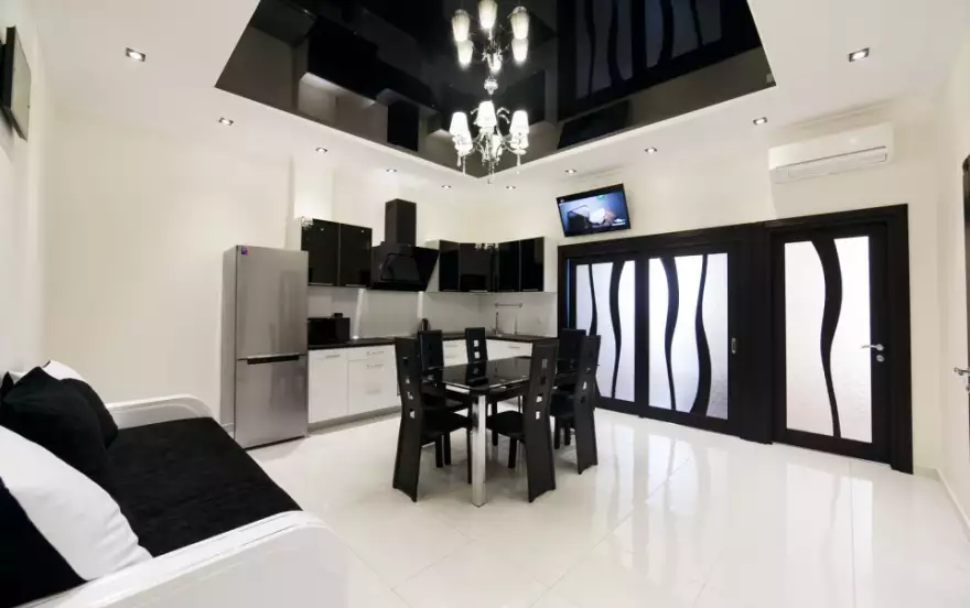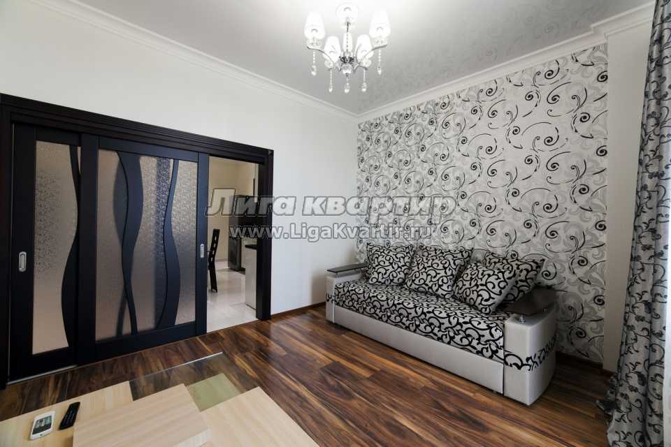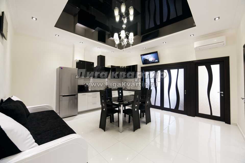 Квартира, площадью 65 кв. м., состоит из 2 спален, кухни-гостиной, холла, санузла и балкона. В первой спальне двуспальная кровать, во второй спальне раскладывающийся двуспальный диван, в гостиной есть диван который тоже раскладывается. Таким образом, можно разместиться 6 гостям. Квартира очень красивая, со стильным ремонтом, укомплектована всей необходимой бытовой техникой и мебелью. Все удобства! Кондиционеры, интернет WiFi, плазменные телевизоры, кабельное ТВ (300 каналов), электроплита, микроволновка, вытяжка, духовка, холодильник, электрочайник, посуда и столовые приборы, стиральная машина, бойлер, холодная и горячая вода, фен, утюг, постельное белье и полотенца.