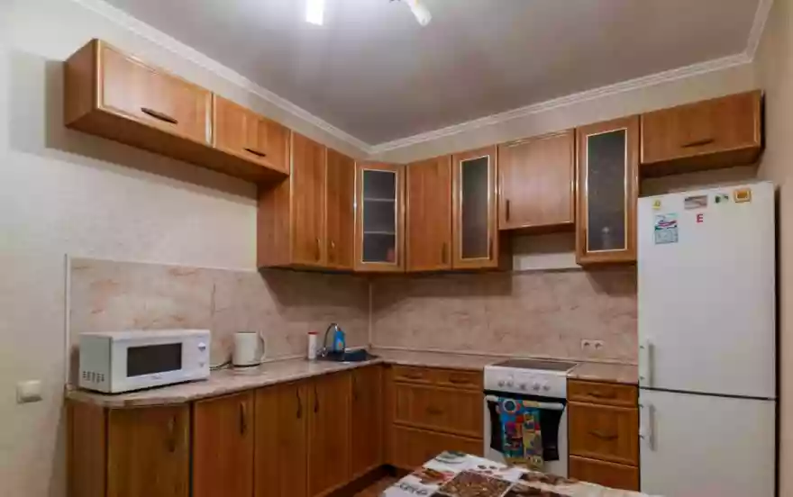 На кухне вся мебель и техника в исправном состоянии. Микроволновая печь, холодильник, электрическая плита, чайник, все кухонные принадлежности для приготовления и приема пищи.