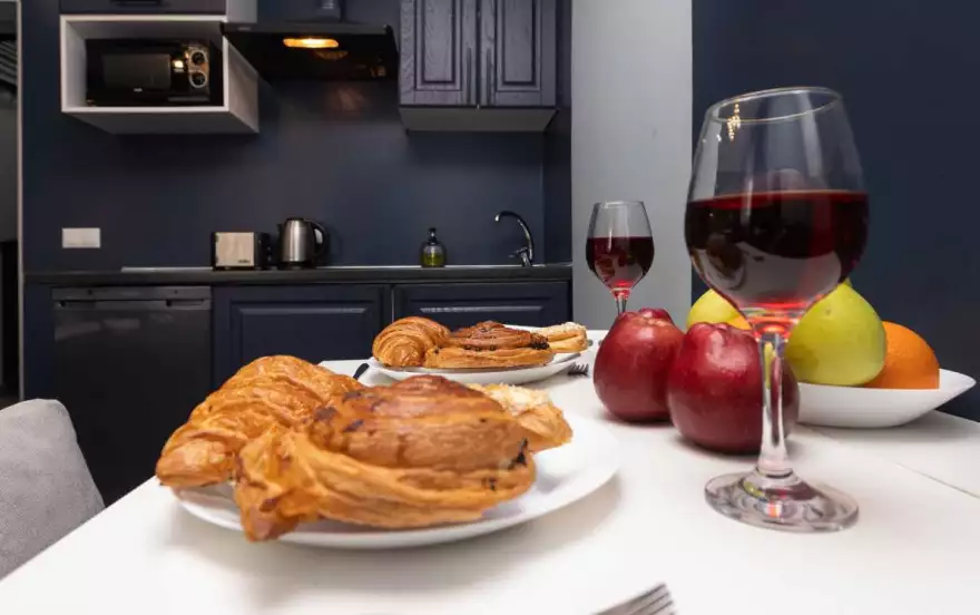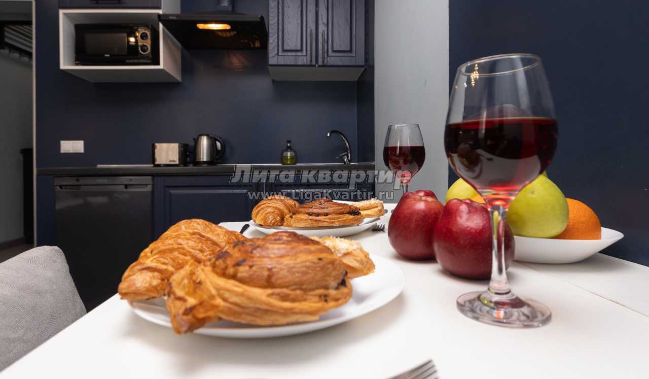 холодильник, микроволновая печь, электроплита, вытяжка, чайник, тостер, кувшин-фильтр для воды, набор посуды и столовых принадлежностей (кастрюли, сковорода и пр.)