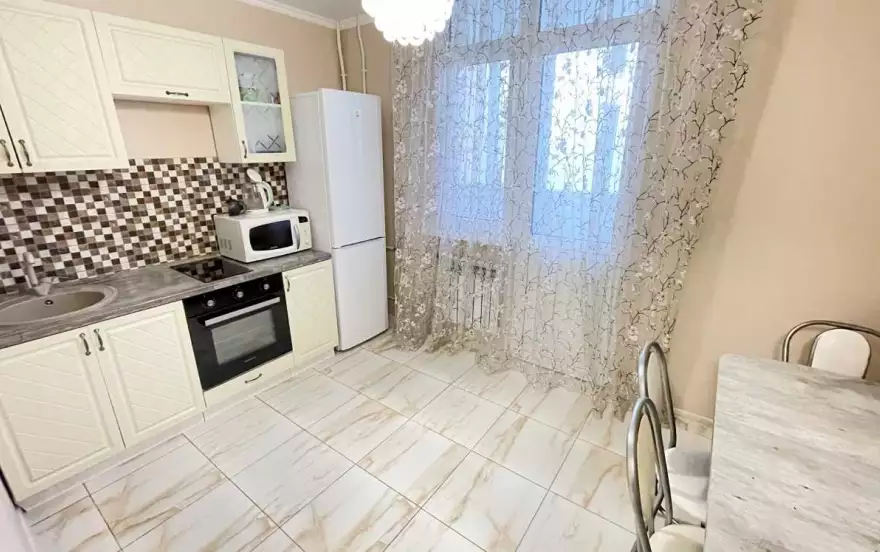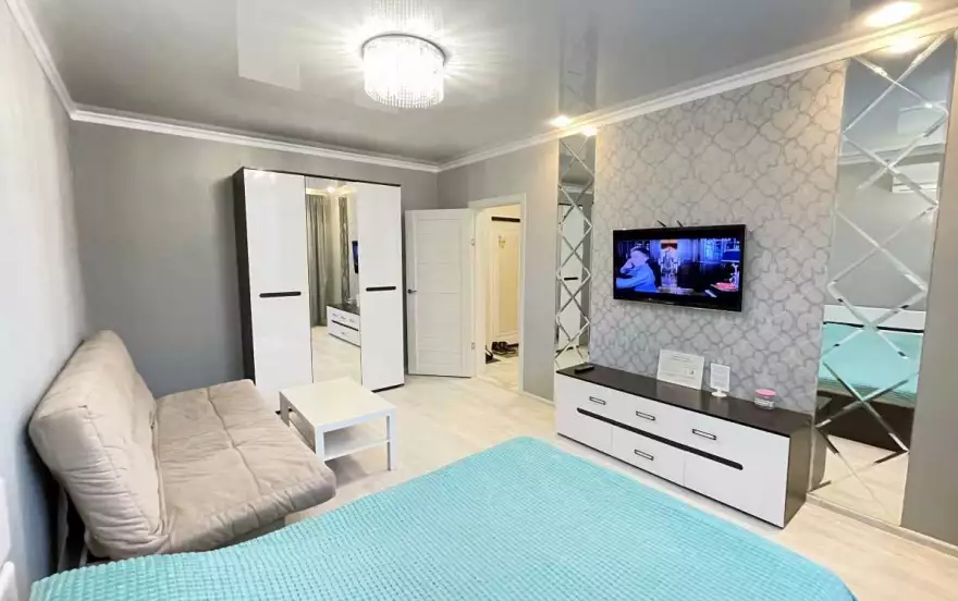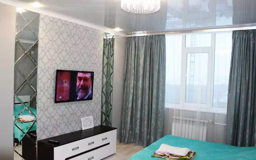 В квартире имеется просторная кухня, со всем необходимым: холодильник, электрический чайник, варочная поверхность, духовой шкаф, микроволновая печь, посуда, большой обеденный стол. Просторная лоджия из кухни с видом на город. В ванной комнате установлена современная стиральная машина, раковина, фен. В комнате имеется комфортная двуспальная кровать, раскладной диван, шкаф. В апартаментах имеется большой 42" дюймовый телевизор, Wi-Fi, цифровое телевидение, утюг.