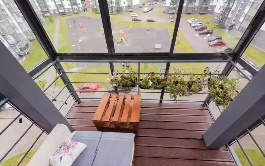 Уютный застекленный балкон с местом для отдыха, где можно встретить рассвет или проводить закат