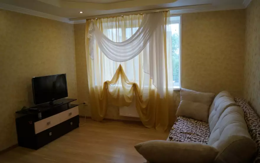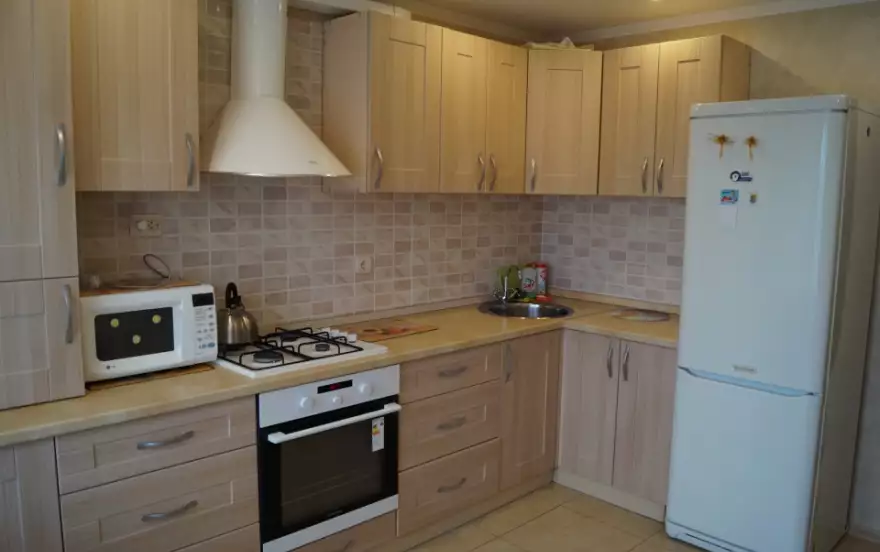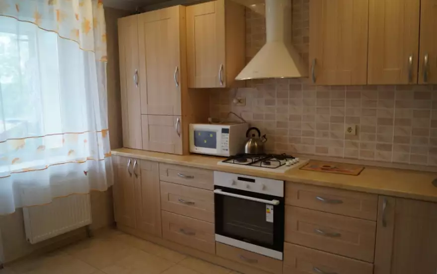Жилая комната оборудована: удобный раскладывающийся диван и кровать, телевизор, Интернет- WiFi, столы, стулья, тумбочки, шкаф-купе. В кухне: кухонный гарнитур, газовая плита, холодильник, стиральная машина, микроволновая печь, чайник и посуда.