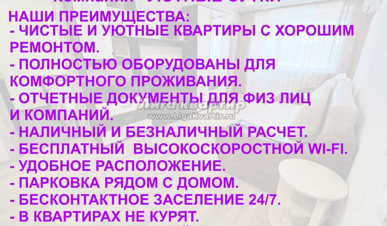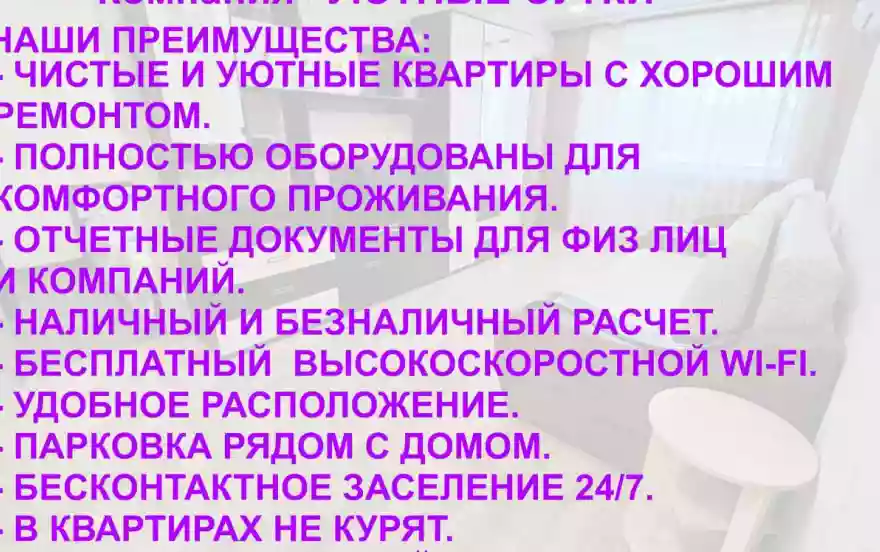 Уютные и чистые квартиры с хорошим ремонтом. После каждого гостя производится уборка с дезинфицирующими средствами. Обязательная смена постельного белья и полотенец. Ваша абсолютная уверенность в безопасности квартиры для Вашего здоровья.