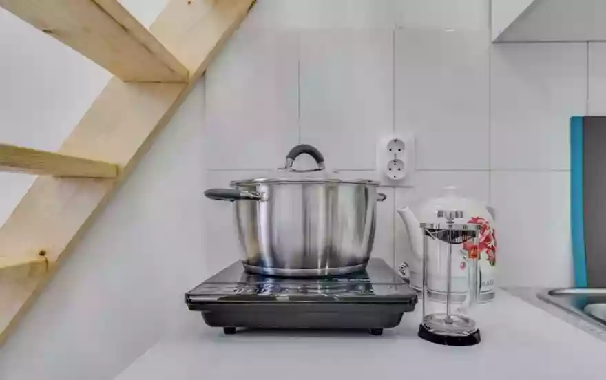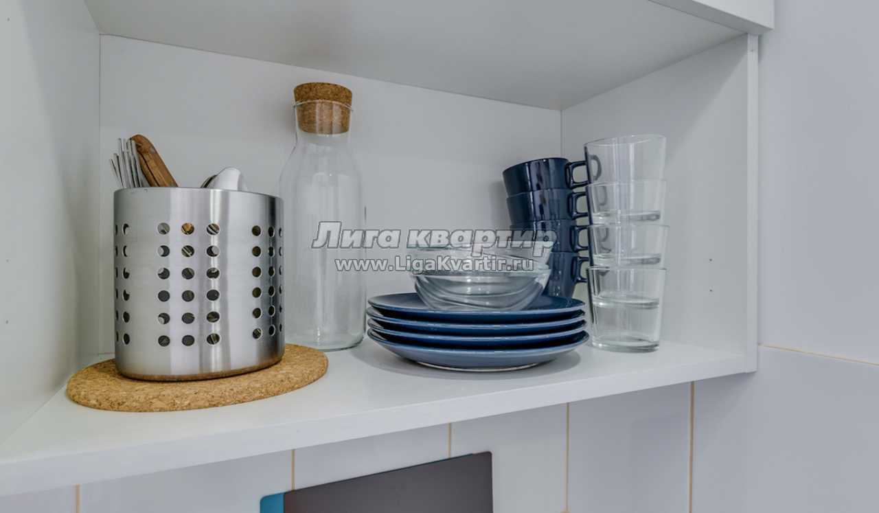 На мини кухне все необходимое для вкусного питания: холодильник, электрический чайник, посуда и кухонная утварь, соль, перец, сахар.