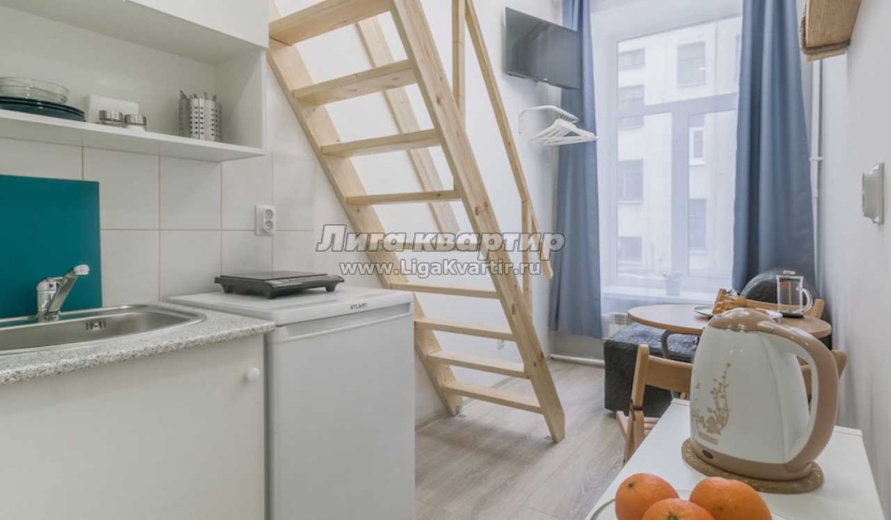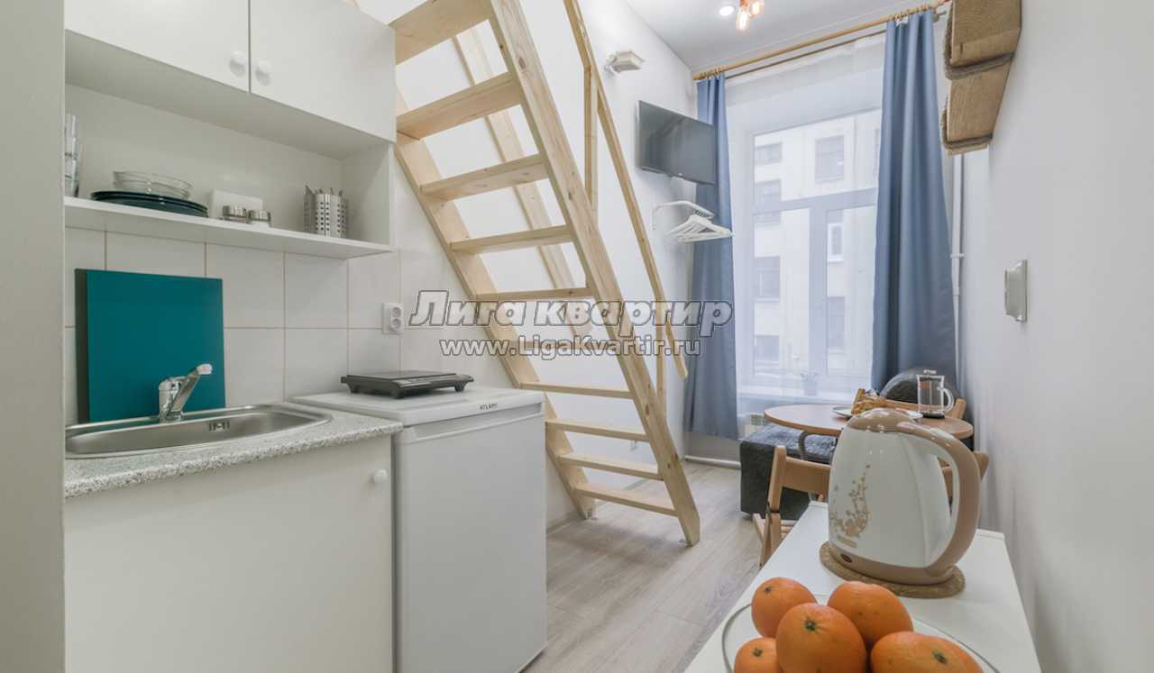 На первом уровне санузел с душем, мини-кухня, гостиная зона с раскладным односпальным креслом-кроватью, стеллаж.