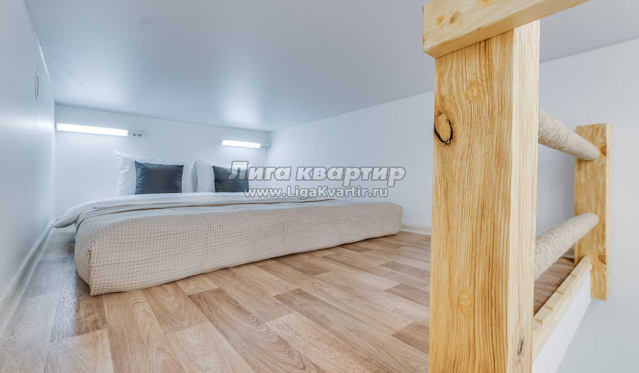 На втором уровне зона отдыха с двуспальным ортопедическим матрасом размера King-size.