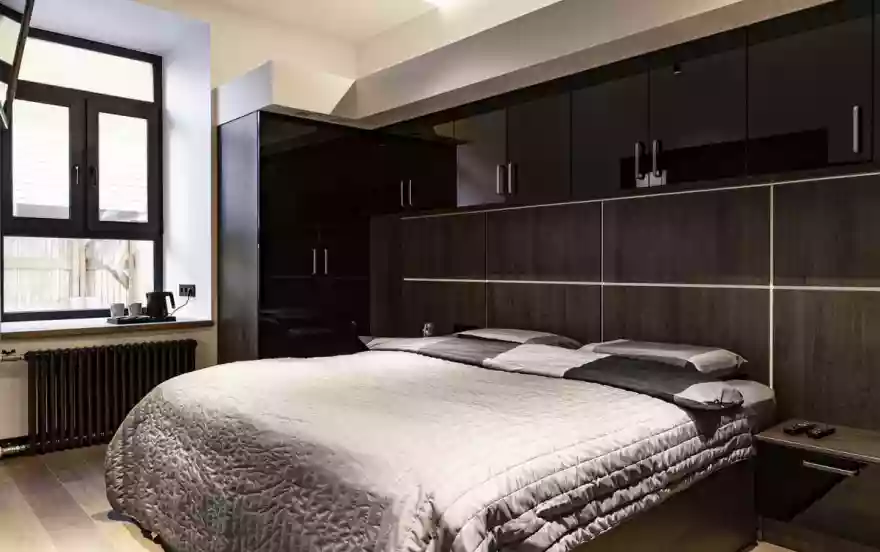 Спальня: двуспальная кровать King Size 200х180, возможность выбора матраца по уровню жесткости (мягкий, жесткий) и подушек по мягкости, регулируемое освещение.