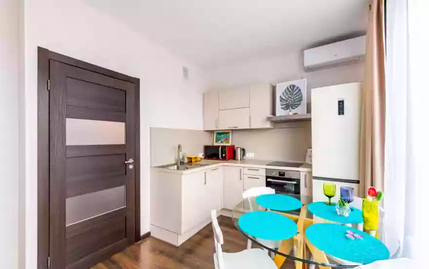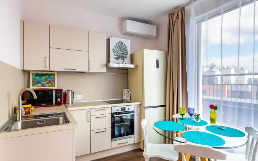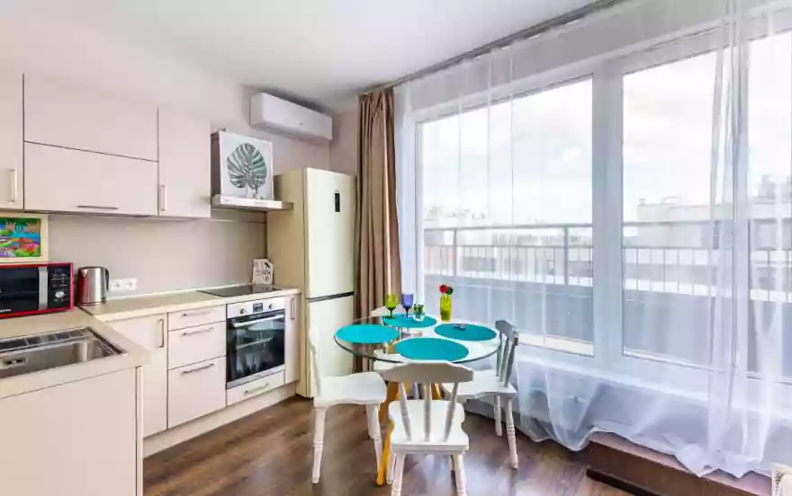 * Современная мебель и ремонт, имеется вся необходимая бытовая техника, вплоть до блендера и мультиварки, посуда.