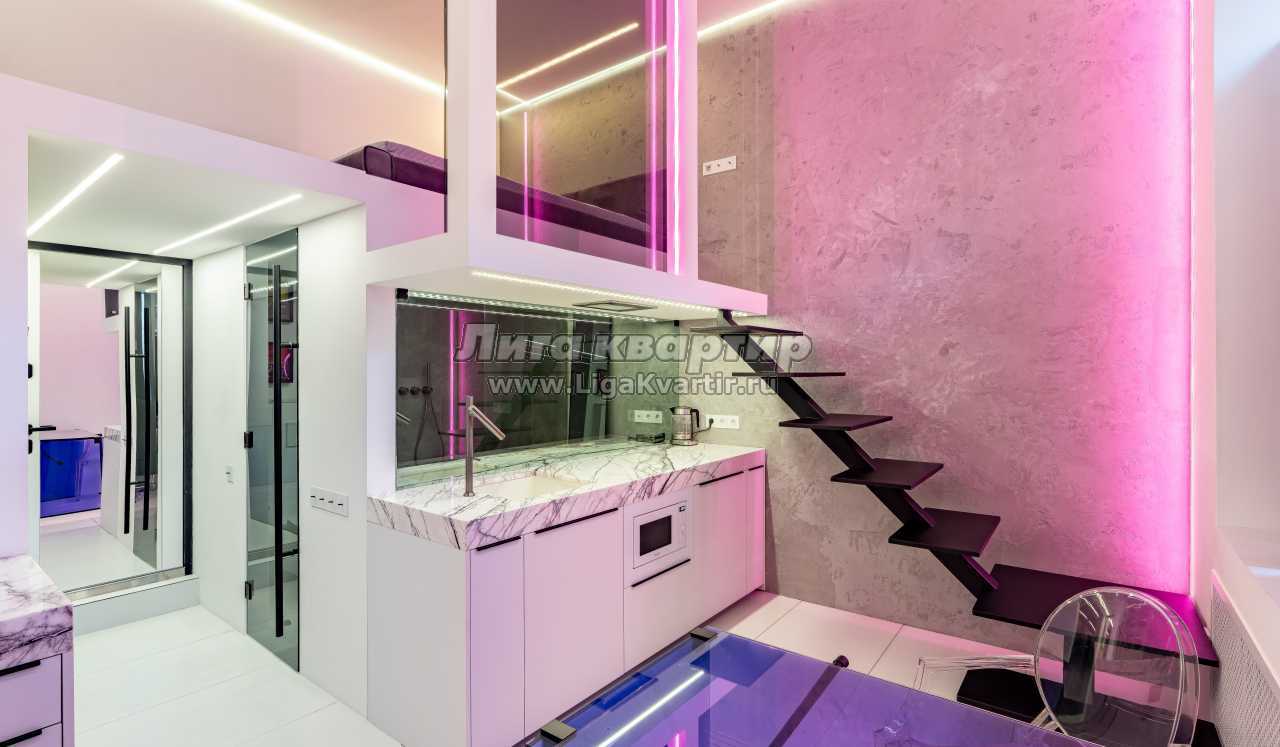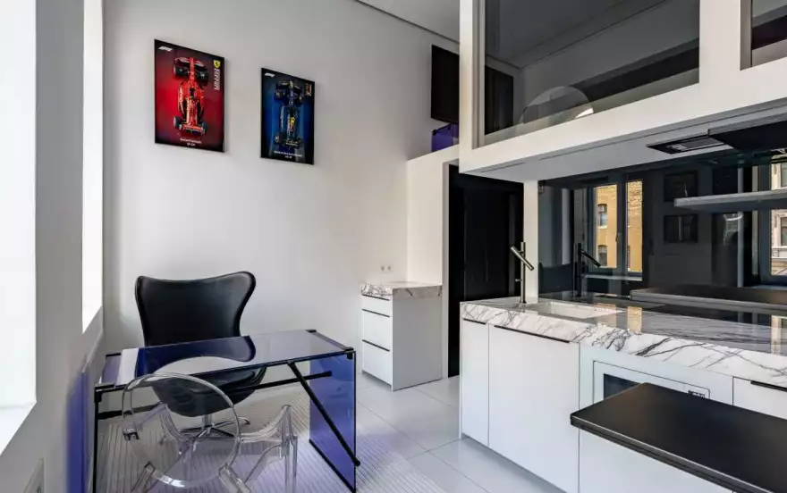 Эта студия — воплощение урбанистического комфорта. Она компактная, но функциональная, с продуманной планировкой и стильной отделкой. Просторный санузел, установлена современная бытовая техника. Кухонная зона оснащена мраморной столешницей, что добавляет ей элегантности. Освещение по всей квартире создает уютную атмосферу, делая вечера особенно приятными.