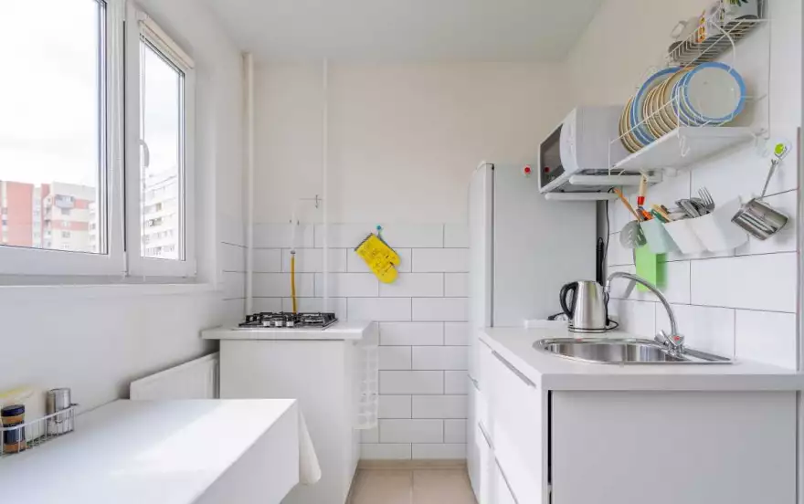 Полностью оборудованная кухня: Газовая печь, микроволновая печь, холодильник, электрический чайник.