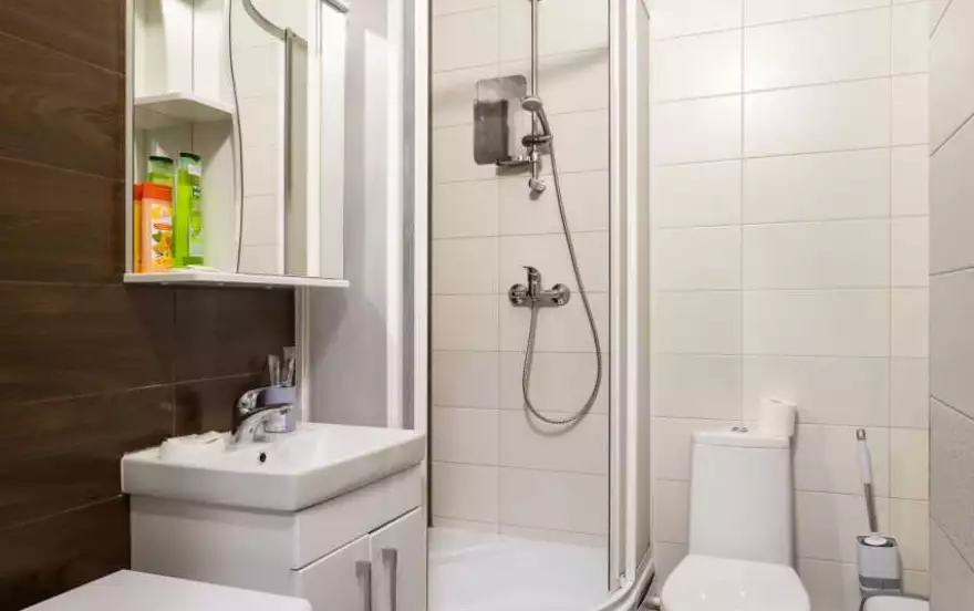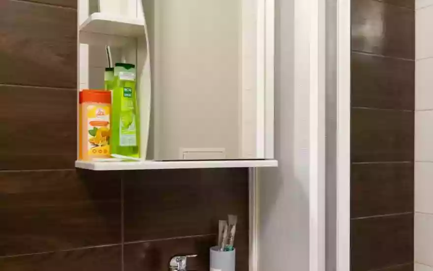 Санузел совмещённый, оснащён душевой кабиной, раковиной, стиральной машиной и базовым набором удобств. Гостям предоставляются полотенца и стандартные принадлежности.