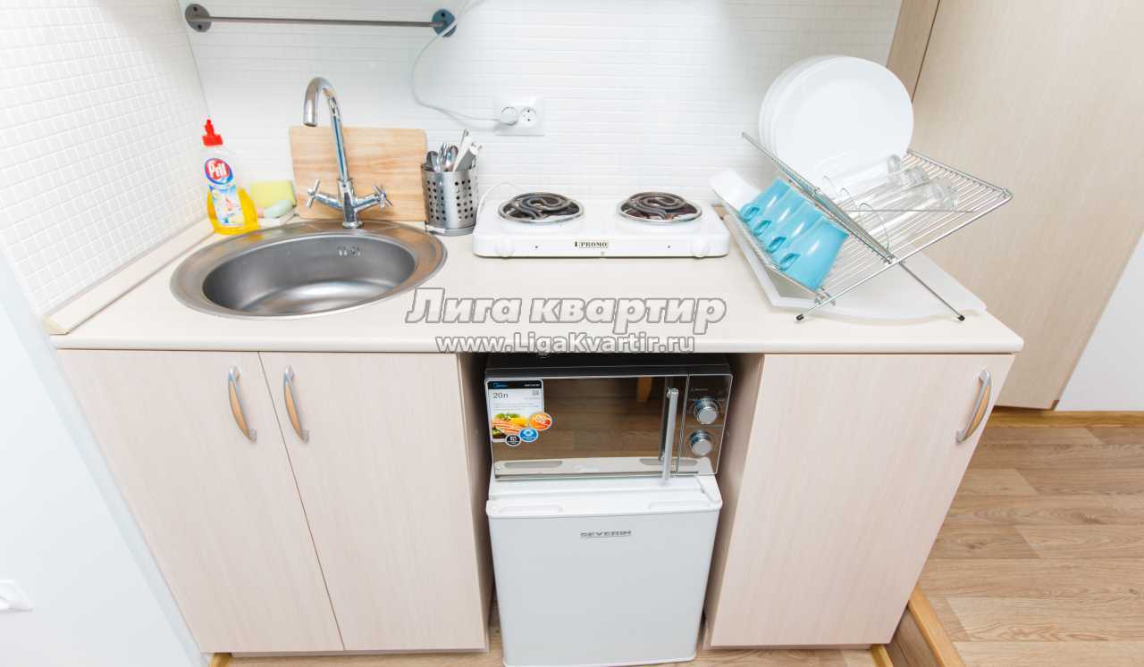 В апартаментах: 1 двуспальная кровать, 1 двухместный диван, собственная душевая и оснащенная всем необходимым мини-кухня!