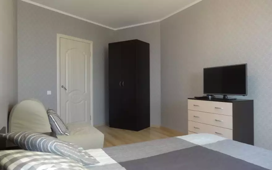 В комнате имеется двуспальная кровать, прикроватные тумбочки, комод, шкаф для одежды, кресло-кровать, телевизор.