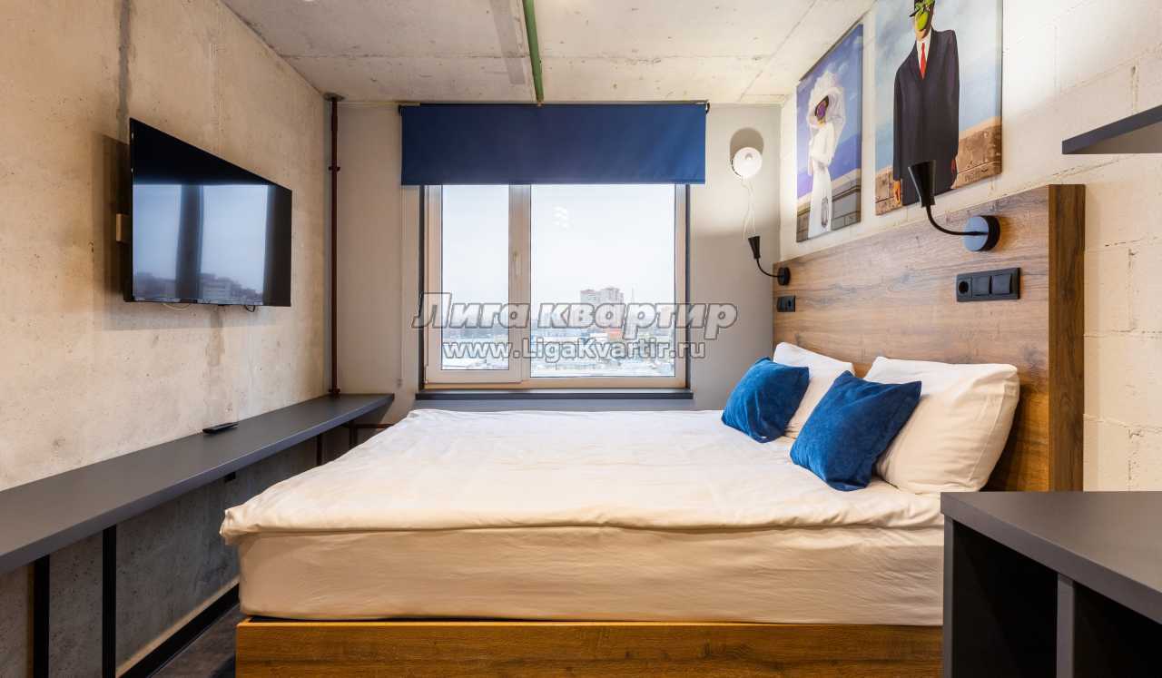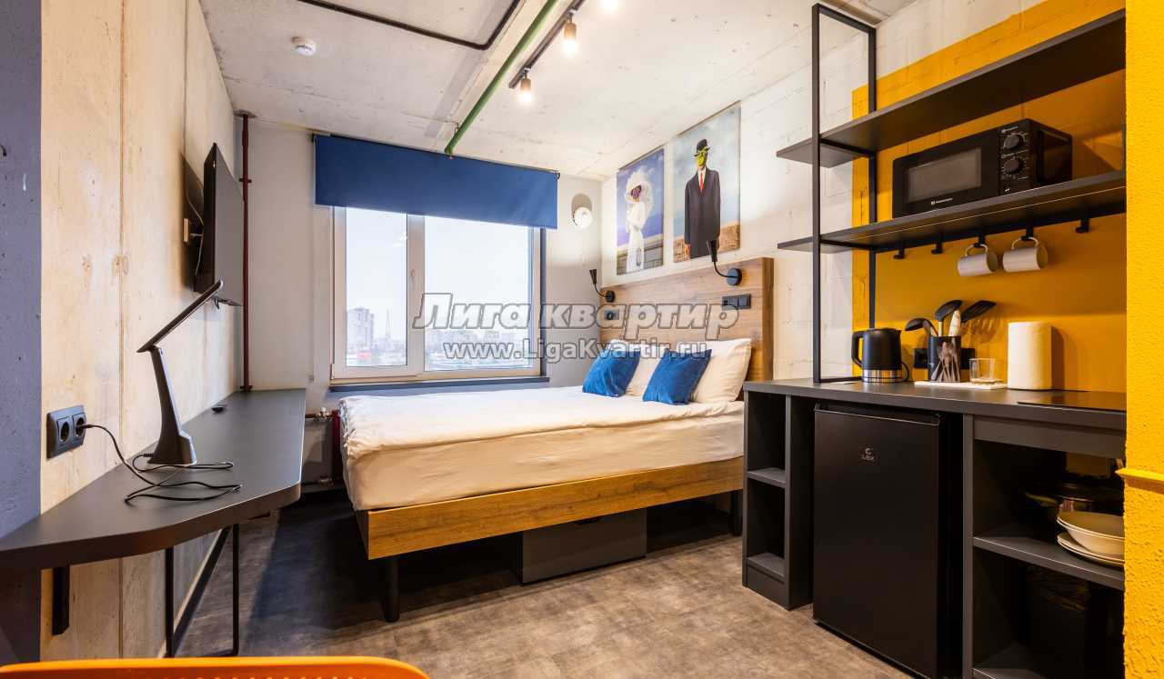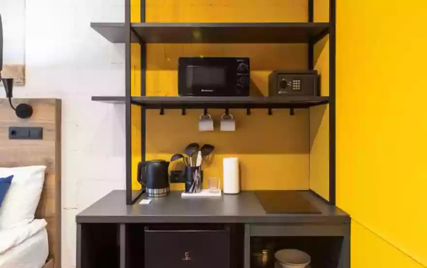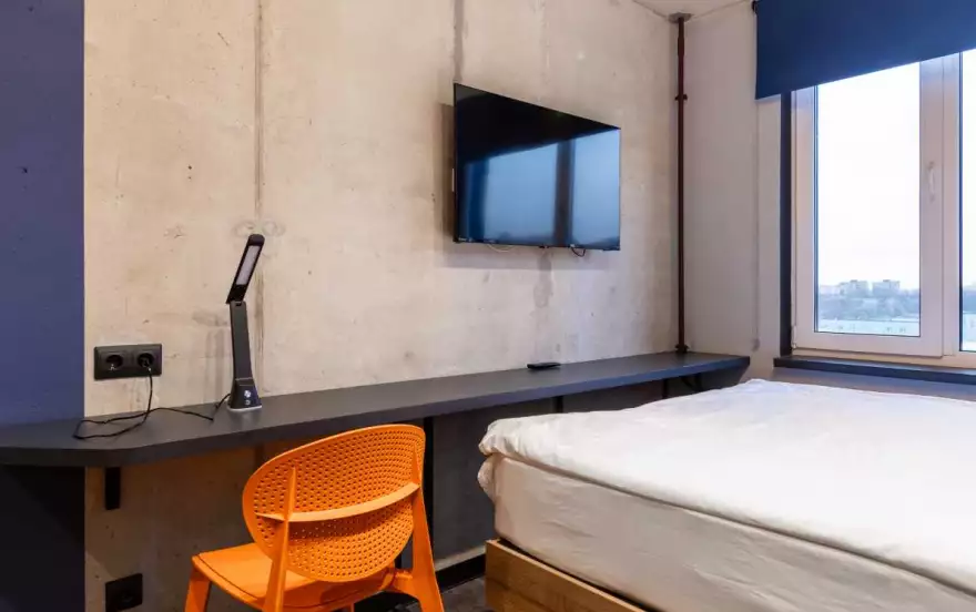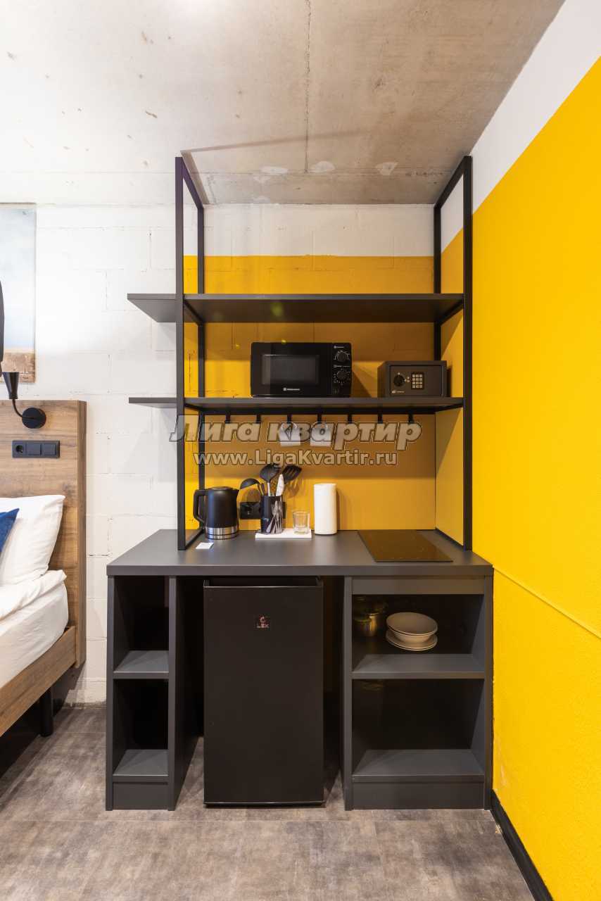В комнате — двуспальная кровать 160×200, рабочая зона с удобным столом и стулом, телевизор, вместительные полки для хранения и сейф. Мини-кухня оснащена варочной панелью, микроволновой печью, холодильником, чайником и базовым набором посуды.