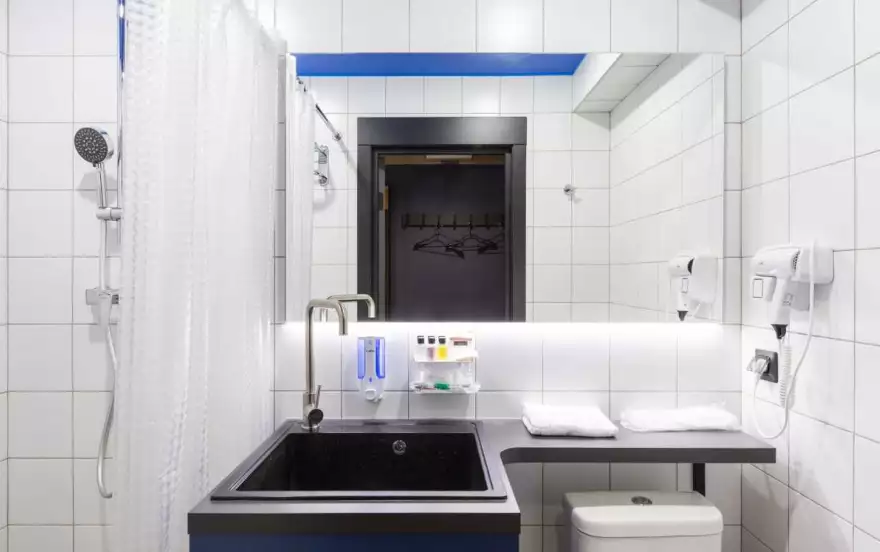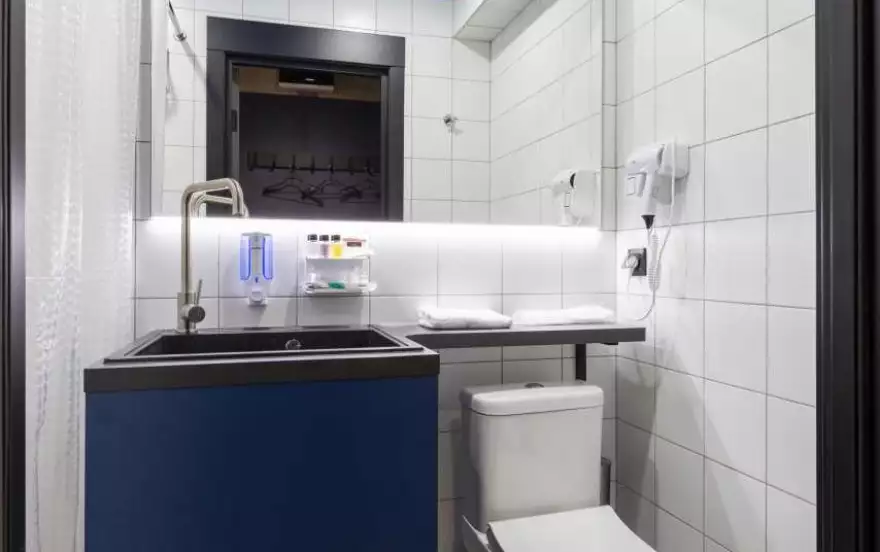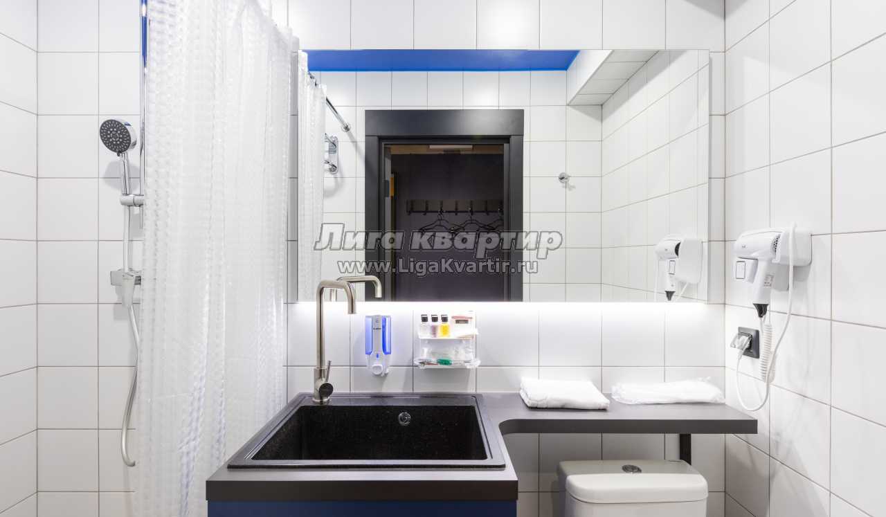 Санузел оборудован душевой зоной, раковиной с подсветкой, феном и всеми необходимыми принадлежностями. Гостям предоставляются полотенца, постельное бельё и шторы блэкаут.