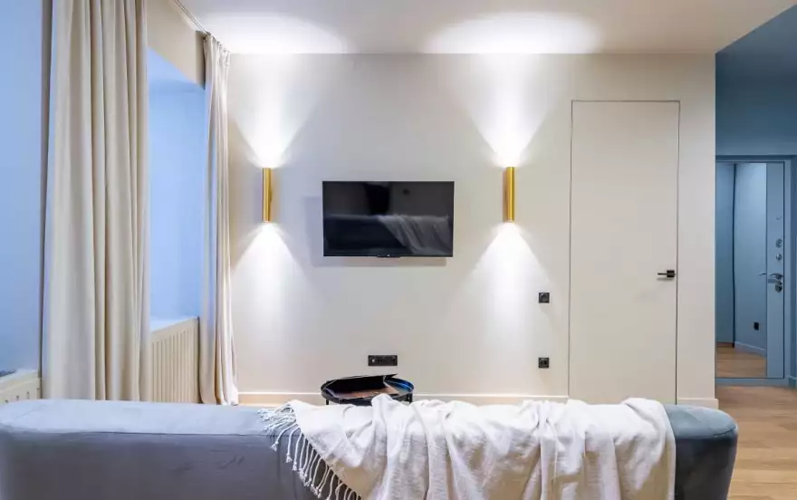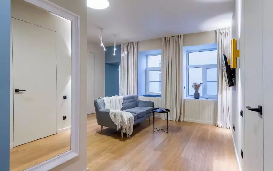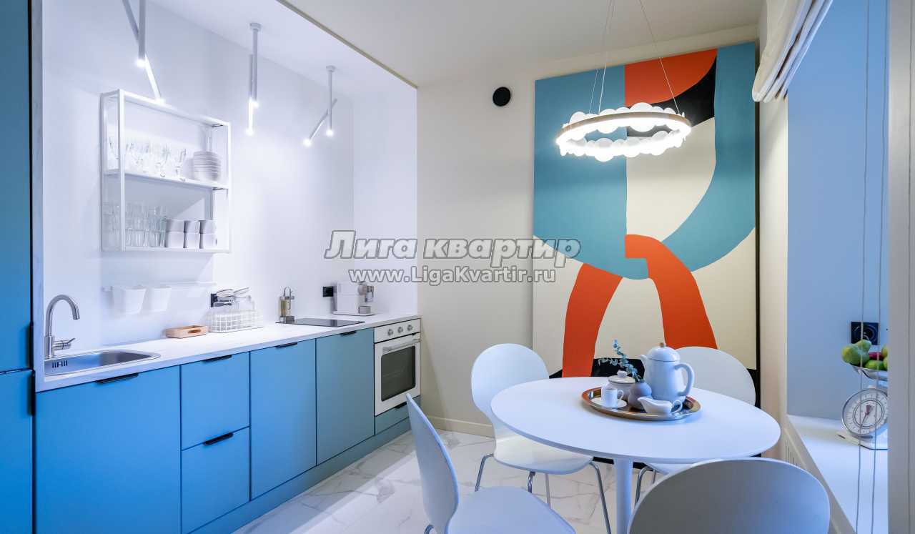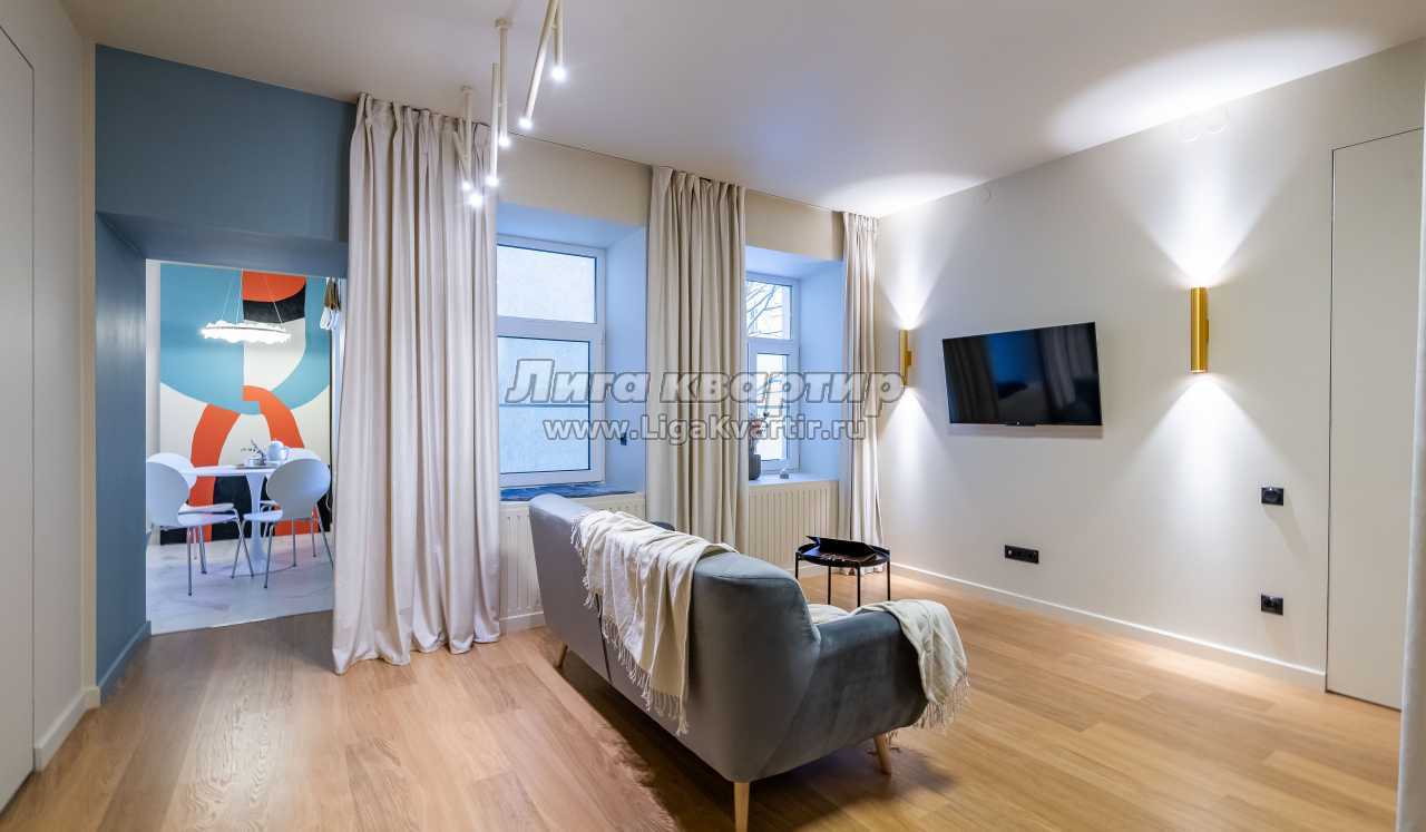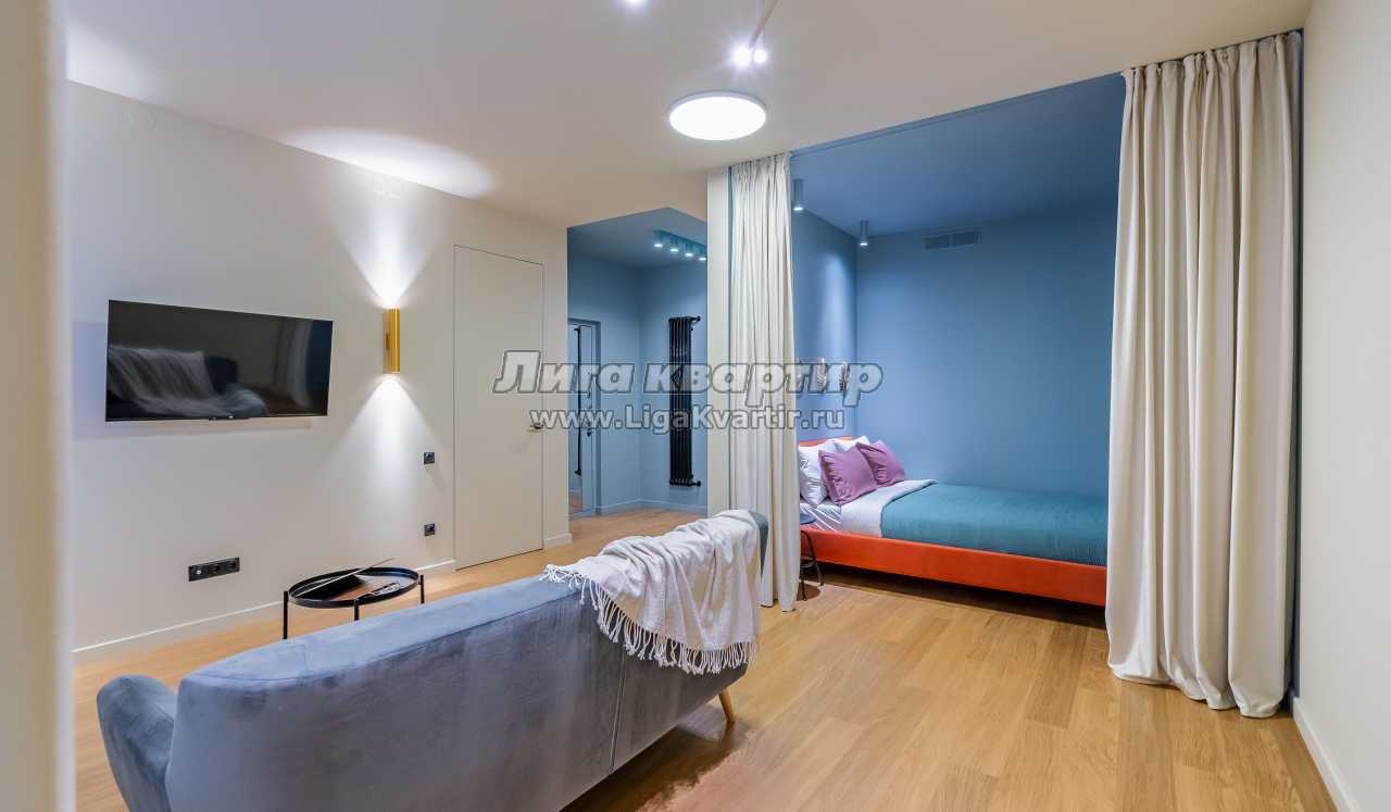 Дизайнерская квартира с новым ремонтом. Состоит из гостиной, кухни и отдельной спальни.