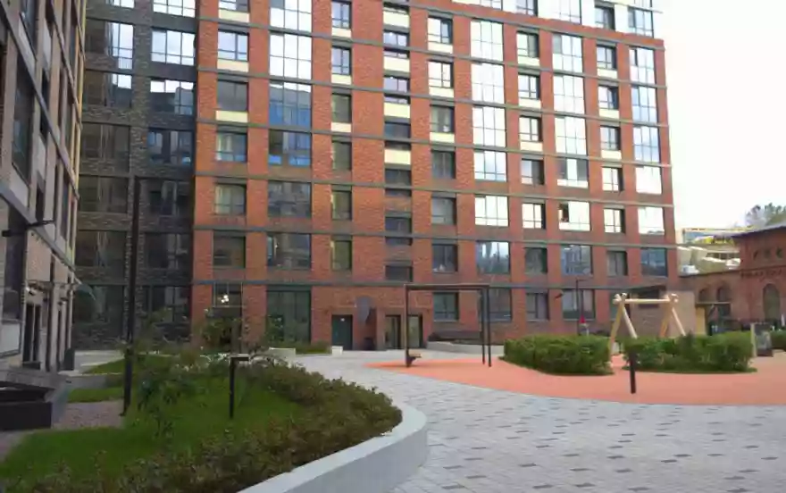Закрытая территория жилого комплекса оснащена детской площадкой, прогулочными зонами и круглосуточной охраной.