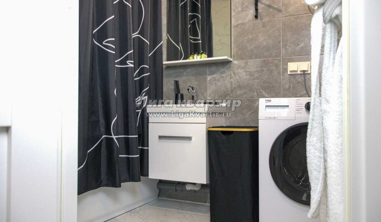 Современный санузел с ванной укомплектован стиральной машиной, полотенцами и фирменными косметическими наборами Flat Inn. Для удобства гостей предусмотрены Wi-Fi и вместительные системы хранения.