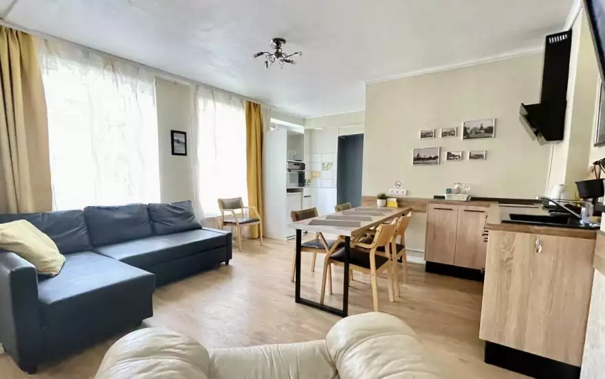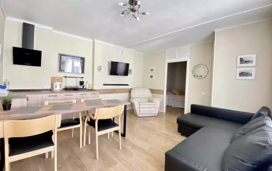 Апартаменты с двумя спальнями. Площадь 48 кв.м. Апартаменты имеют прихожую, гостиную, 2 спальни, ванную комнату и туалет. В каждой спальне большая двуспальная кровать. В гостиной раскладной диван.