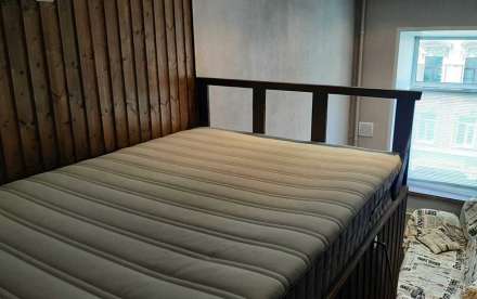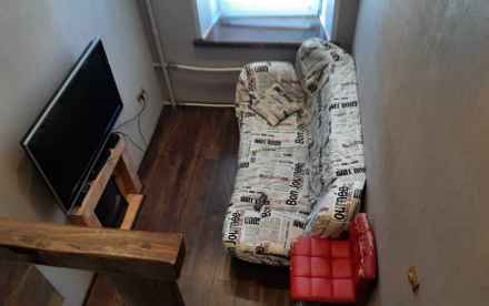 В самой комнате сделано разделение зон: спальное место с углублением под шкаф или иное хранение вещей , встроенный сейф ( 2 этаж ), гостевая зона с диваном и телевизором и электрическим камином, и кухонная зона с холодильником и микроволновкой.