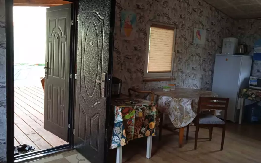 В доме есть просторная кухня: холодильник, микроволновка, чайник, электроплита, мультиварка, посуда.