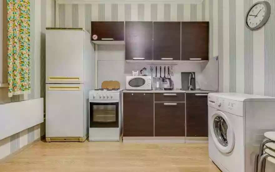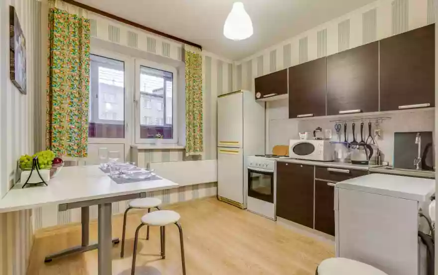 Кухня: Полутороспальный диван-кровать, раскладной столик со стульями, электрическая плита, духовка, стиральная машинка, холодильник, морозилка, электрический чайник, застеклённая лоджия для курения, вся необходимая посуда для приготовления и приёма пищи.