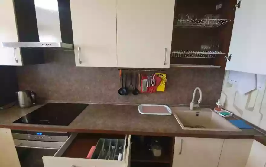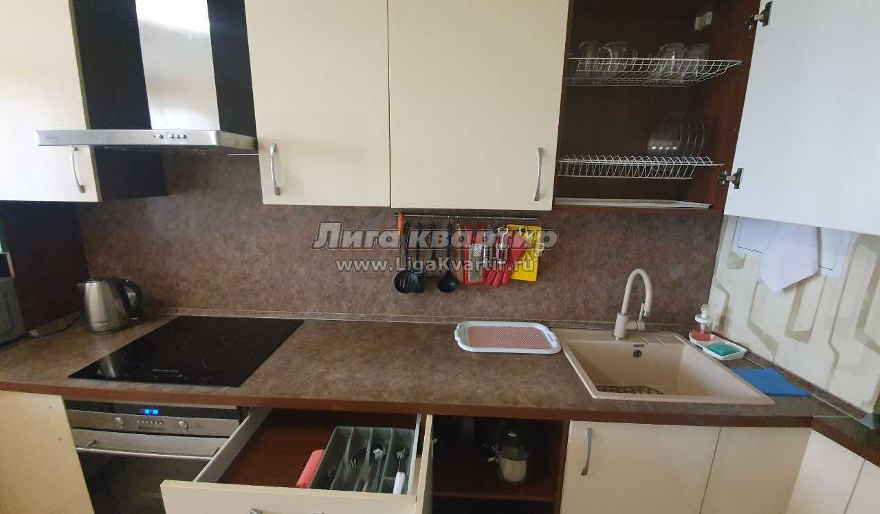 Кухня: Стол со стульями, варочная панель с духовкой, холодильник с морозилкой, микроволновая печь (СВЧ), электрический чайник, застеклённая лоджия для курения, вся необходимая посуда для приготовления и приёма пищи.