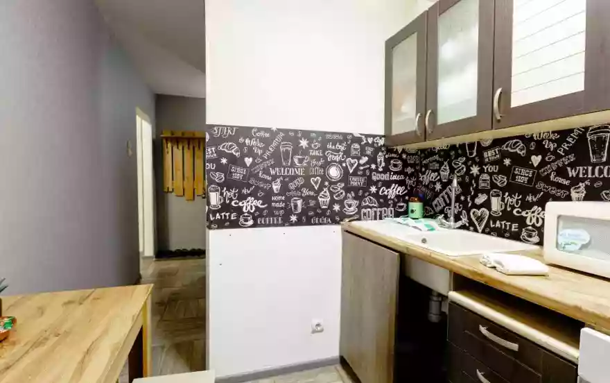 - Полноценная кухня с обеденной зоной, оборудованная плитой, чайником, холодильником, СВЧ (микроволновая печь) и кухонными приборами (тарелки, кружки, столовые приборы, сковорода, кастрюля)