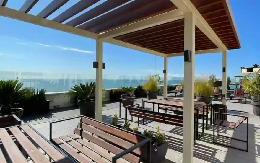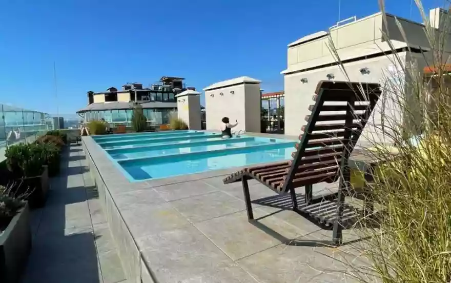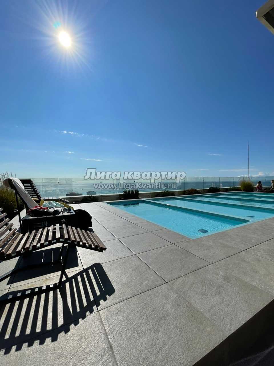 На крыше дома на 17 этаже располагается круглогодичный панорамный бассейн. Прямой вид на море, на ботанический парк "Дендрарий" и город Сочи. Режим работы с 9.00 до 21.00, каждый день. Вода пресная и подогревается до 23 градусов. Бесплатный доступ к нему всем проживающим в доме. Бассейн неглубокий, поэтому идеально подойдет также для деток. Около бассейна есть лежаки, всё в свободном доступе.