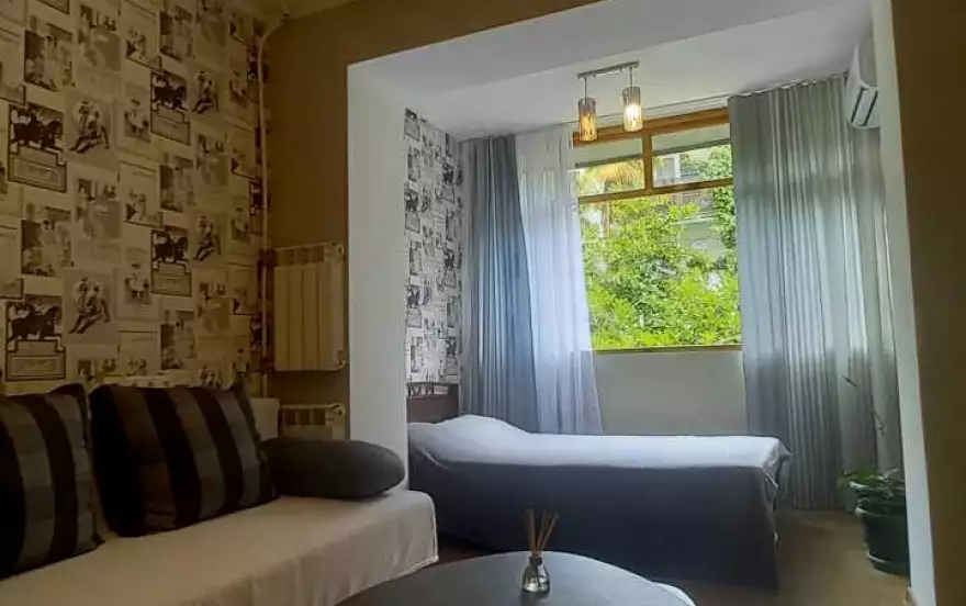Возле ж/д вокзала Сочи.2 этаж шестиэтажного клубного дома. Полноценная ванна. Холодильник, чайник, плита, микроволновая печь, кондиционер, Стиральная, wi-fi, спутниковое ТВ, кондиционер.