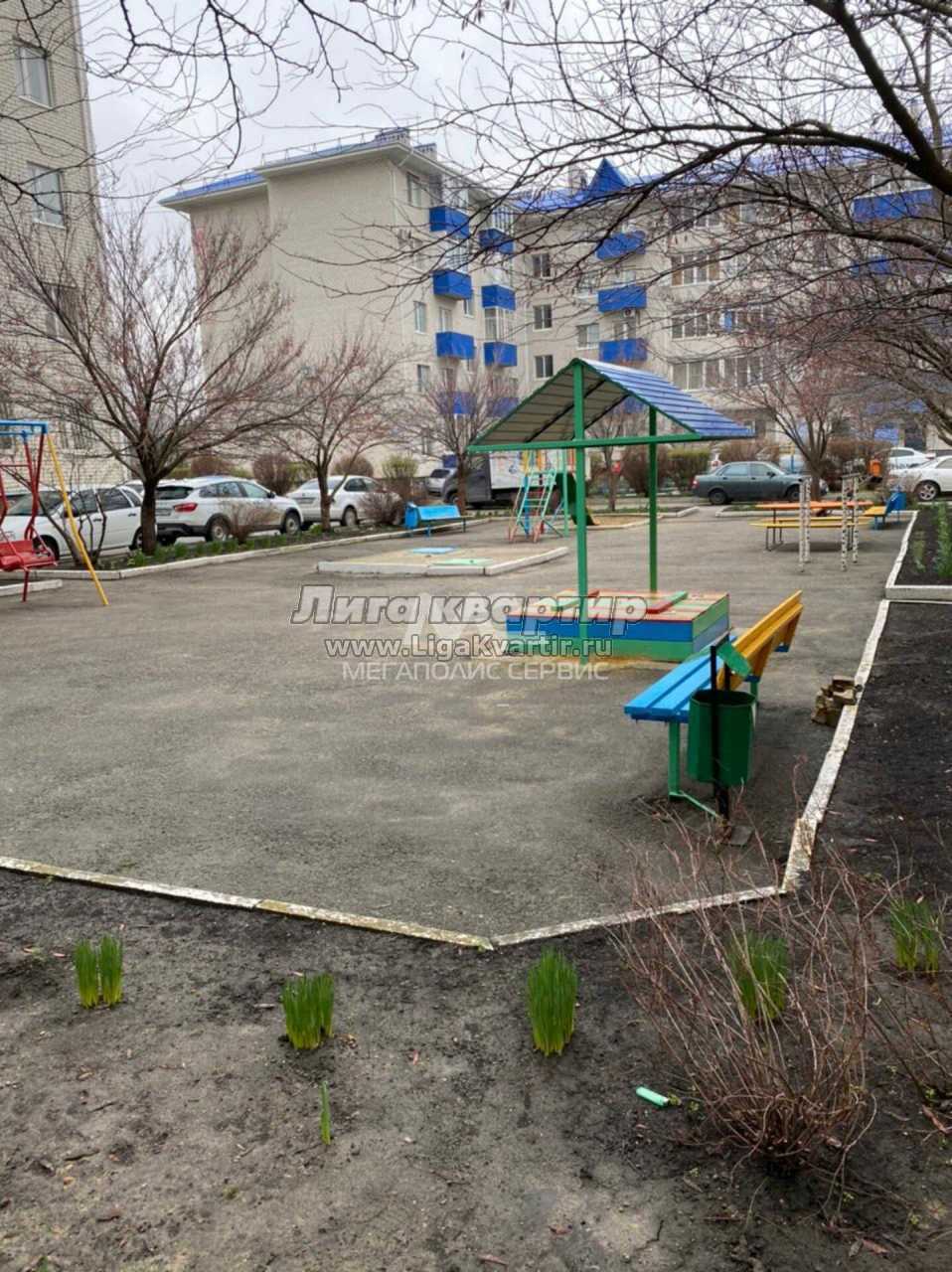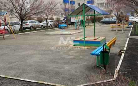 Во дворе детская площадка, открытая парковка.