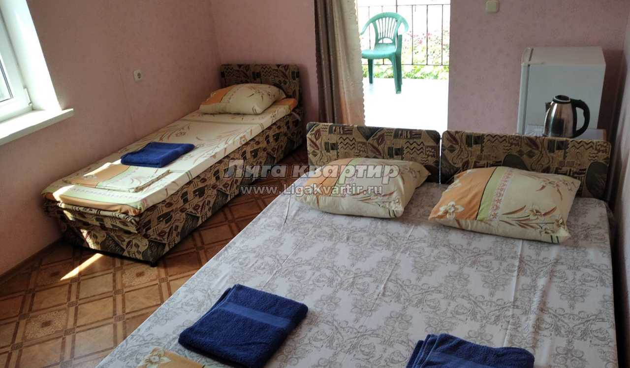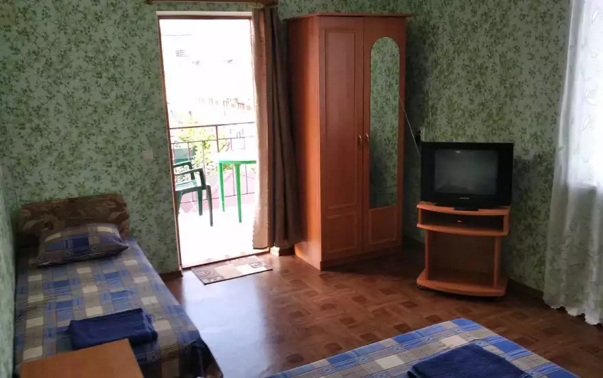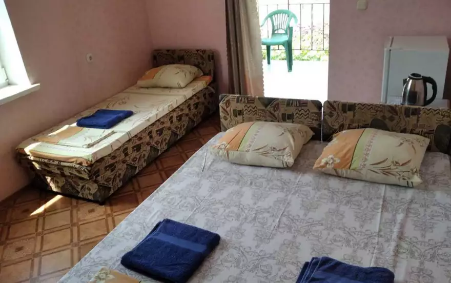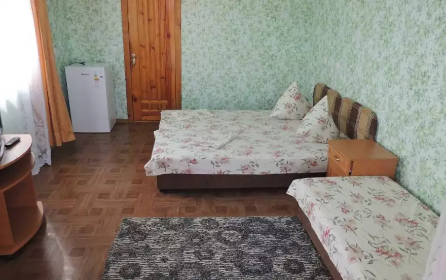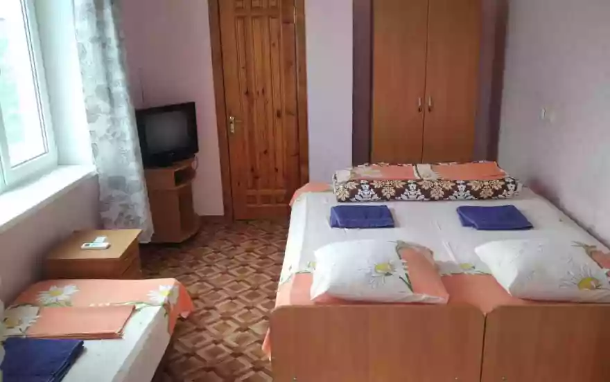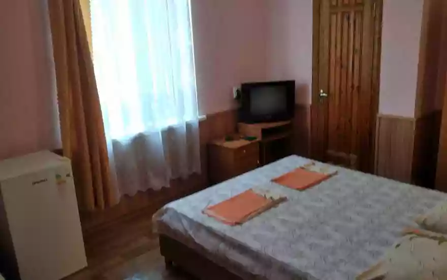 В номерах: душ, туалет, умывальник (холодная и горячая вода - постоянно), кровати, тумбочки, шкаф для одежды, телевизор, холодильник, кондиционер, Wi-Fi. Большой двор для бесплатной стоянки машин. Общая кухня для самостоятельного приготовления пищи со всем необходимым (три газовые печки, мойка, посуда, дополнительные холодильники, микроволновая печь), мангал. Возле кухни большой навес со столиками. Предпочтение отдается тихому, спокойному отдыху, когда всем комфортно.