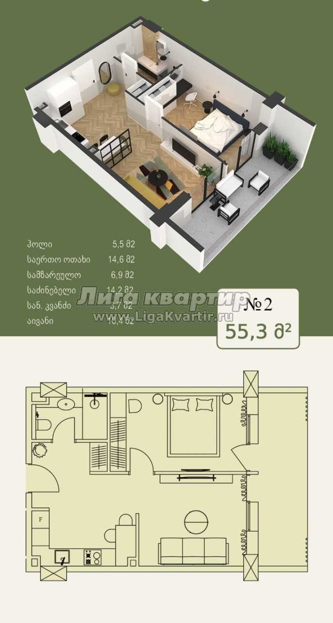 - Общая площадь: 55 м²