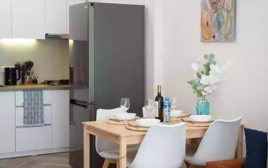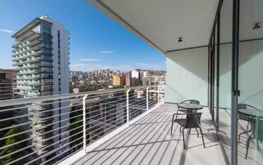 Наша уютная и стильная квартира на 15 этаже расположена в самом сердце района Сабуртало – всего в 5 минутах ходьбы от станции метро Делиси и других видов общественного транспорта.