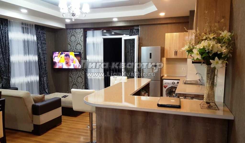 - В квартире: Мебель в комнатах / Холодильник / Стиральная машина / Кондиционер / Можно с животными / Интернет / Телевизор / Можно с детьми / Мебель на кухне