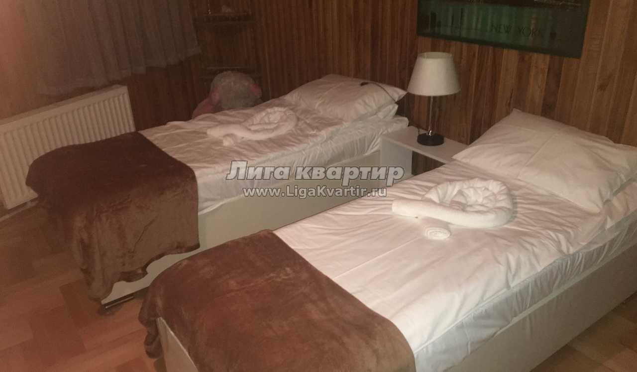 На 1-м этаже отдельный вход, две спальни, в каждой по одной односпальной кровати и полуторной кровати, в каждой спальне могут разместиться 3 человека. (Обе спальни закрываются на ключ) 1 общая гостиная с камином, где на диванах-кроватях могут разместиться 2 человека. Есть ТВ, интернет, 1 кухня и 1 ванная-туалет.