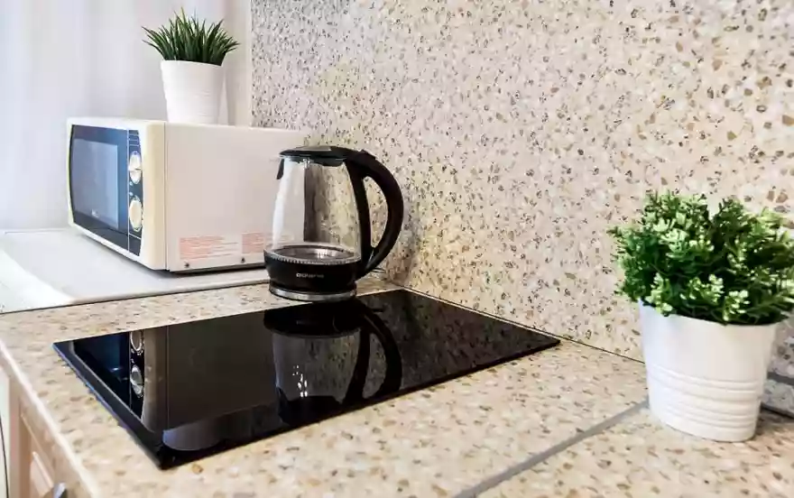 ✔ Просторная кухня с варочной поверхностью, вместительным холодильником, микроволновой печью, красивой посудой и всем необходимым для приготовления любимых блюд