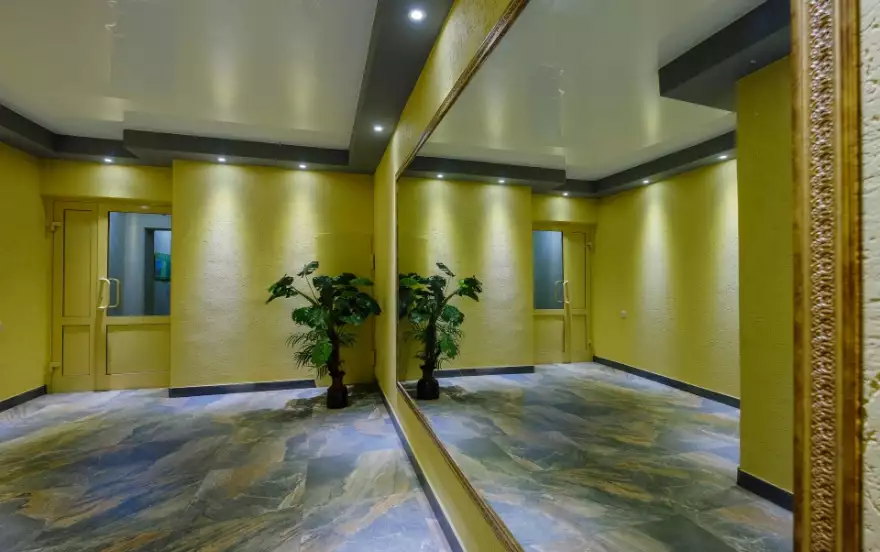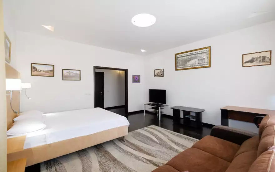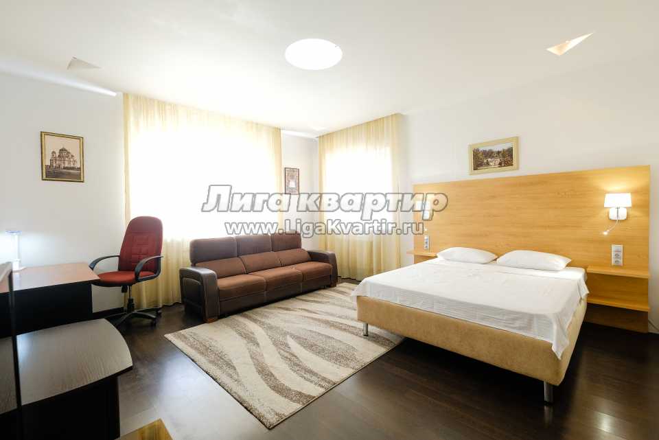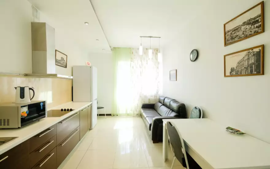 Уютный дизайн и современное оснащение номера (высокоскоростной интернет, мини-холодильник, микроволновка, TV, фен и DVD) — здесь есть все для вашего комфорта Апартаменты расположены на девятом этаже кирпичной новостройки в центре города.