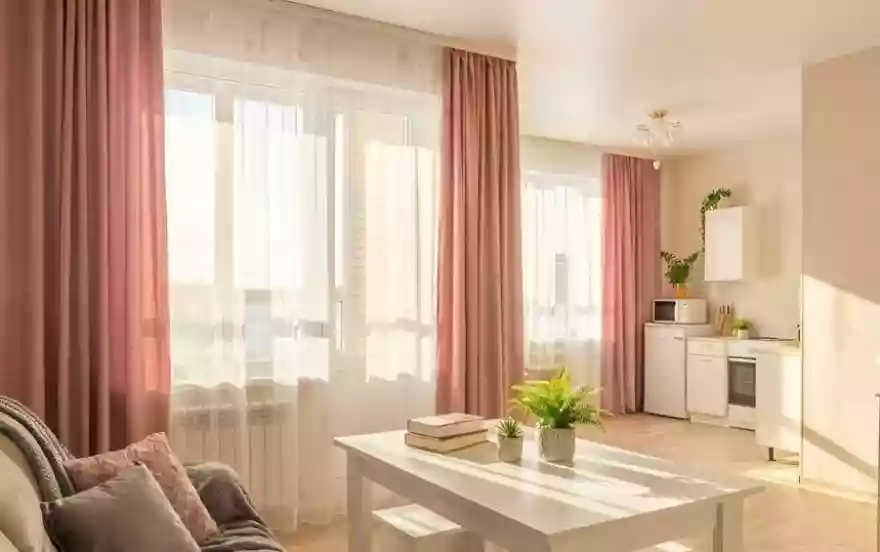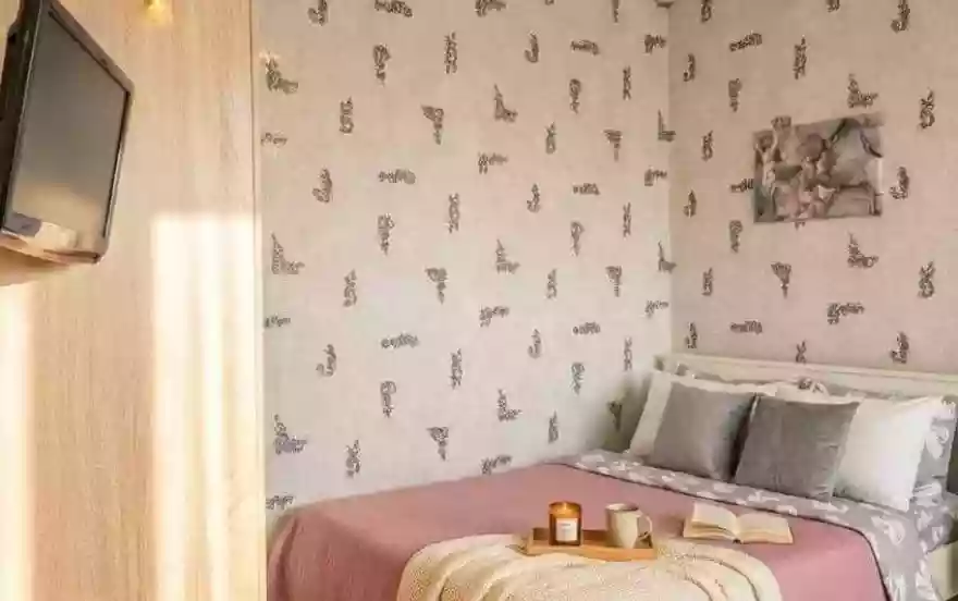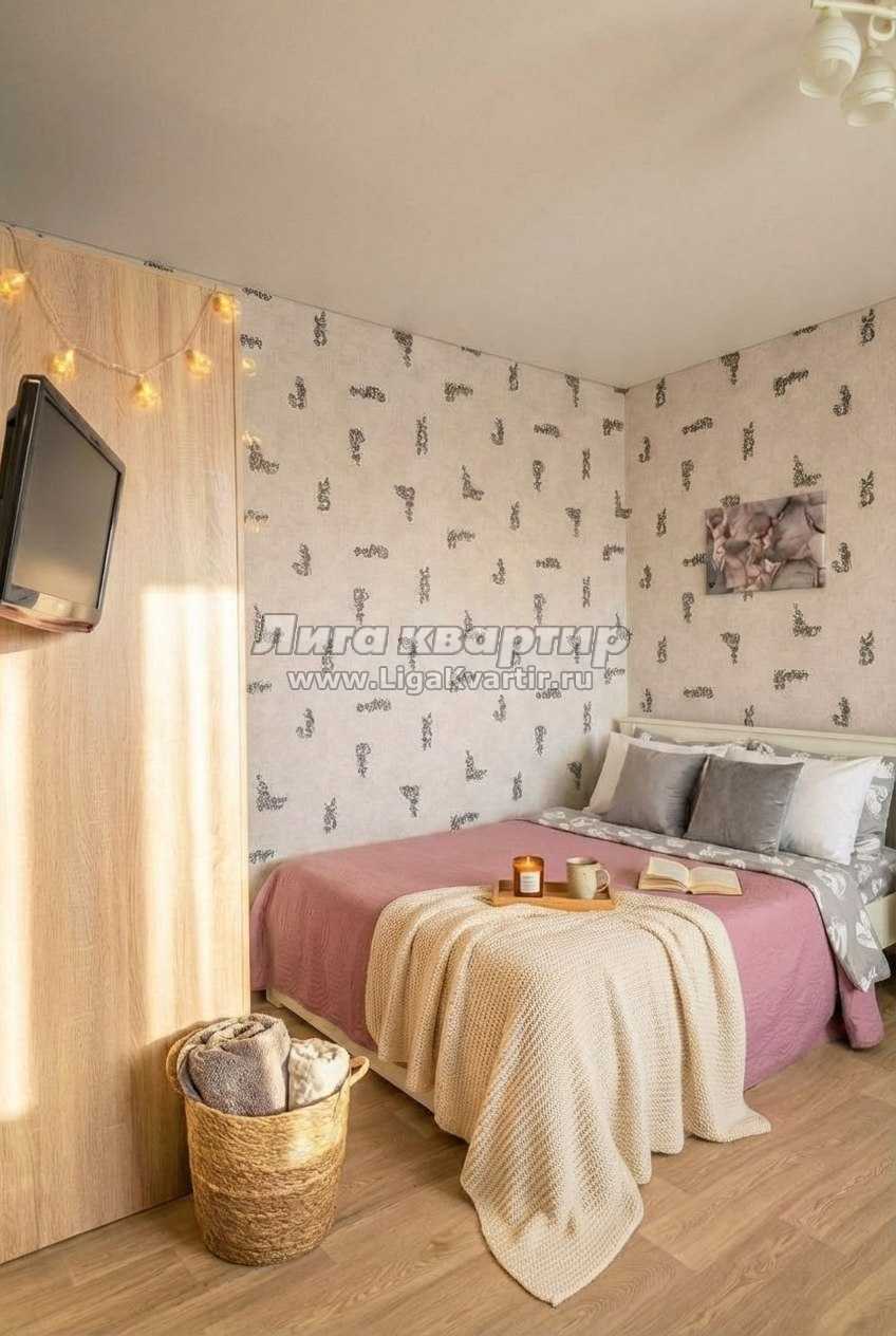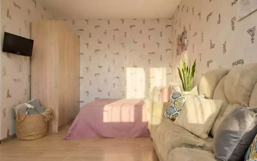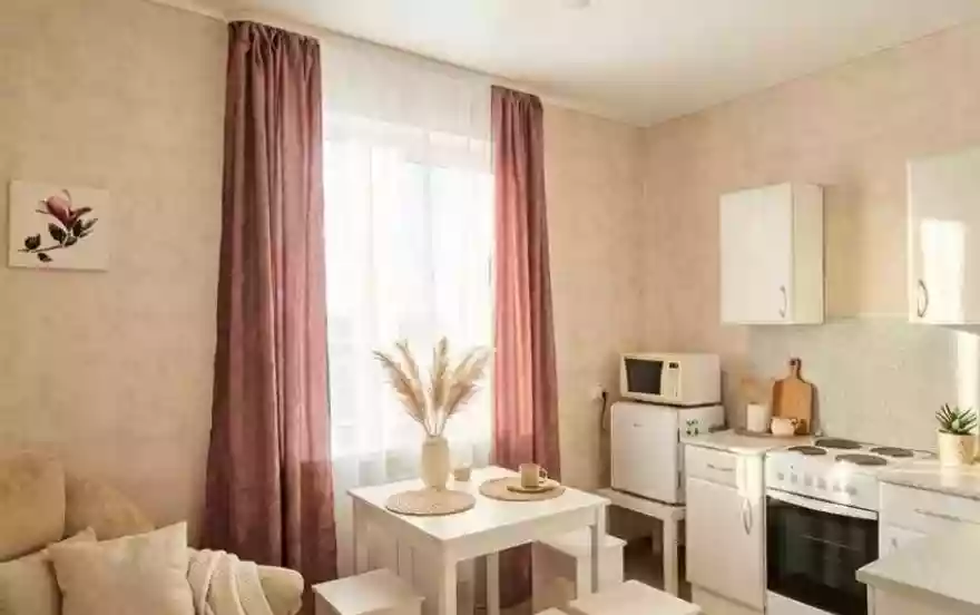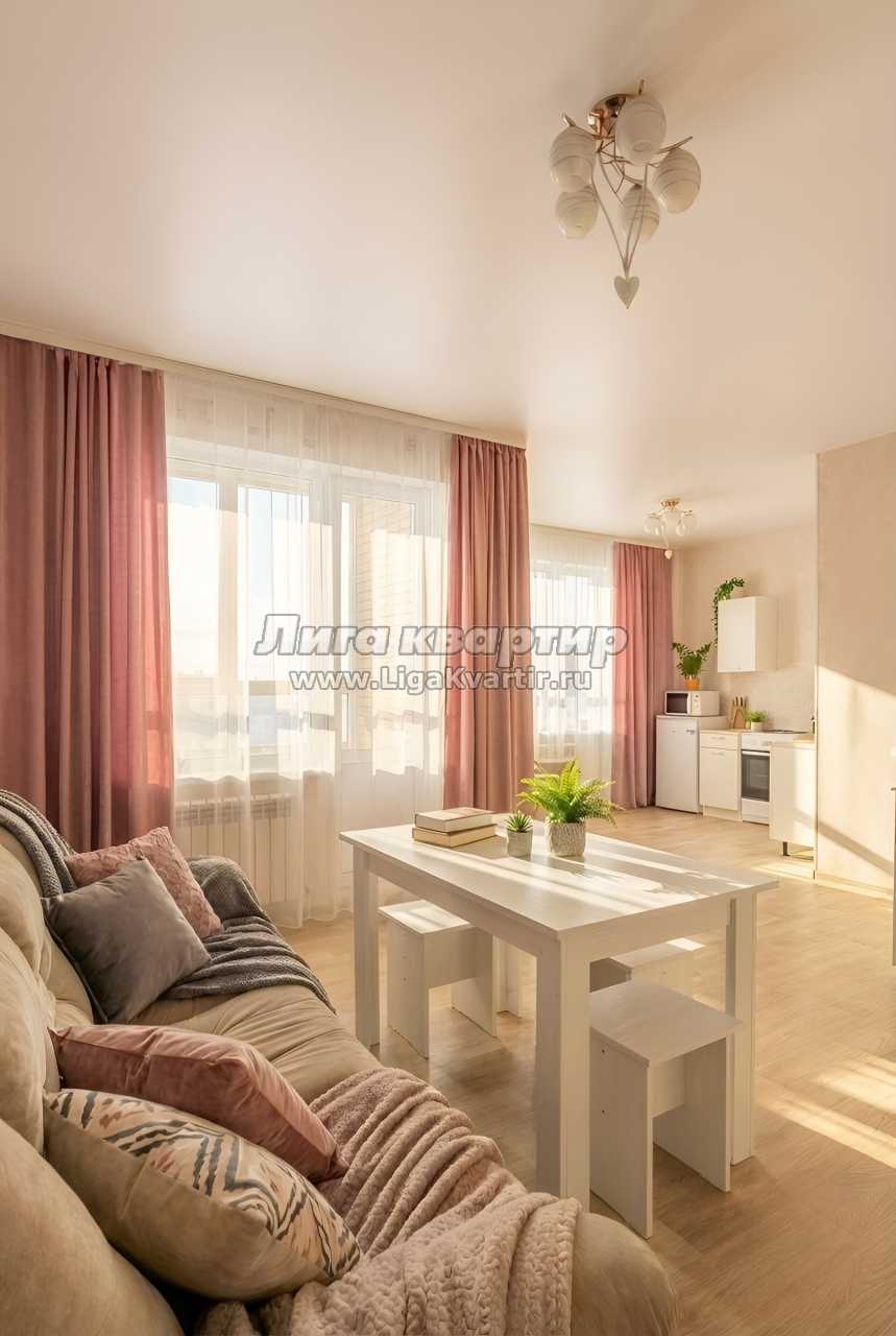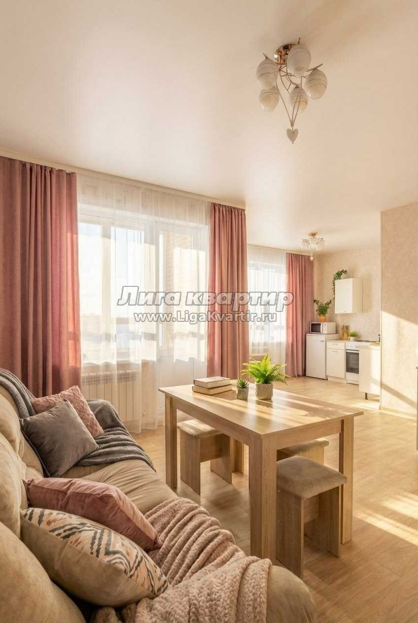 Внутри квартиры: Просторная студия (гостиная объединена с кухней). Здесь стоят удобная двуспальная кровать и раскладной диван — можно разместить ещё одного гостя. У кровати есть прикроватная тумбочка и настольная лампа — удобно для чтения. Также есть кресло. Имеется шкаф для вещей, шторы. Телевизор, Wi‑Fi. Полотенца, свежее постельное бельё и стартовые принадлежности подготовлены.
