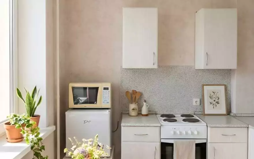 Кухонная зона: холодильник, электрическая плита, микроволновка, электрочайник, набор посуды, обеденный стол и табуретки.