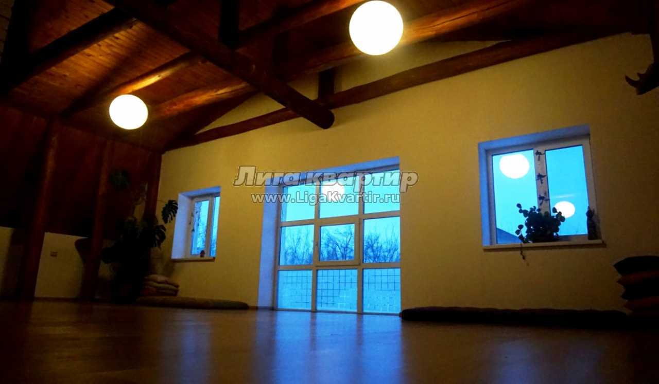 Это мансарда в стиле шале. Тёплые деревянные полы, высокие потолки, панорамные окна, отделка деревом и натуральными брёвнами на бревенчатом каркасе можно подвешивать большие грузы (до 200–300 кг), это может быть удобным для йоги и др.спортивных практик.