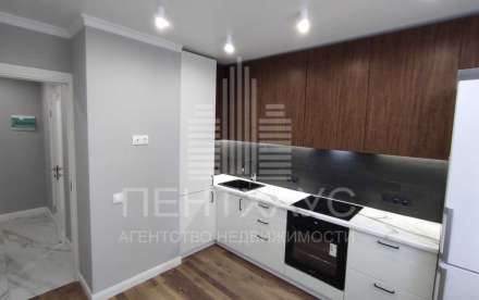 Керамическая плитка в прихожей и ванной, дорогой ламинат фирмы Кандал (Австрия) на кухне и в зале, вся встроенная мебель сделана на заказ, духовой шкаф и варочная панель Самсунг, вытяжка, холодильник Аристон.