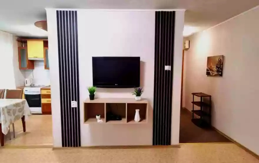 К вашим услугам квартира со всем необходимым для комфортного проживания: бытовая техника, телевизор, двуспальная кровать, раздвижной двуспальный диван, кровать, шкафы, плита, посуда, необходимая для приготовления и принятия пищи, утюг, гладильная доска, стиральная машина, пылесос, титан, чистое постельное белье и полотенца, фен. Спальных мест 5 (2+2+1).