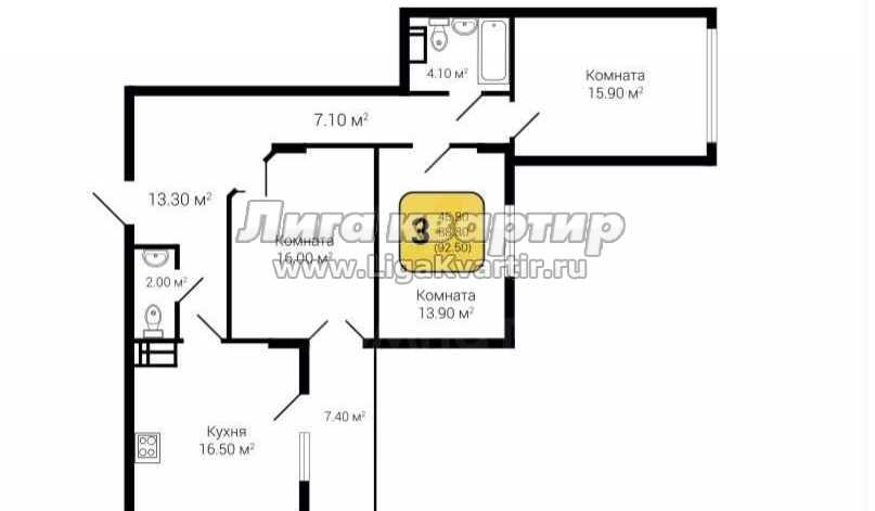 - Общая площадь: 92.5 м²