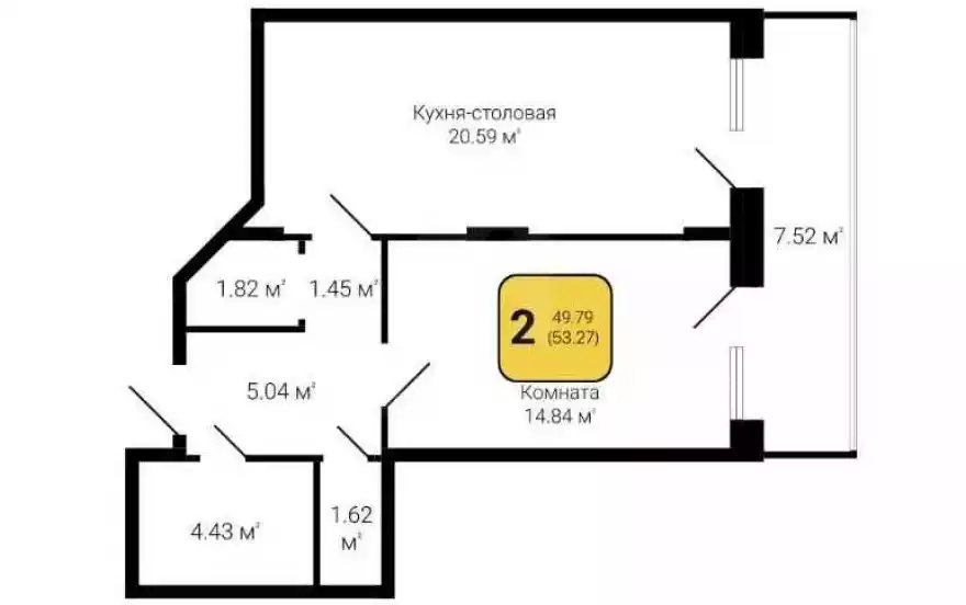 2-комнатная Площадь: 49.7 м2 Этаж: 5/20
