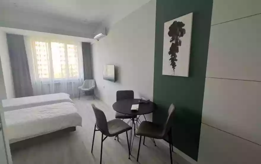 В апартаментах выполнен дизайнерский ремонт, интерьер оформлен в лаконичных тонах. Планировка: кухонная зона, спальня, санузел.