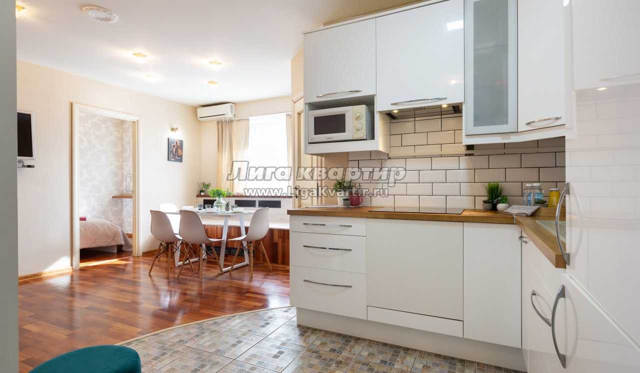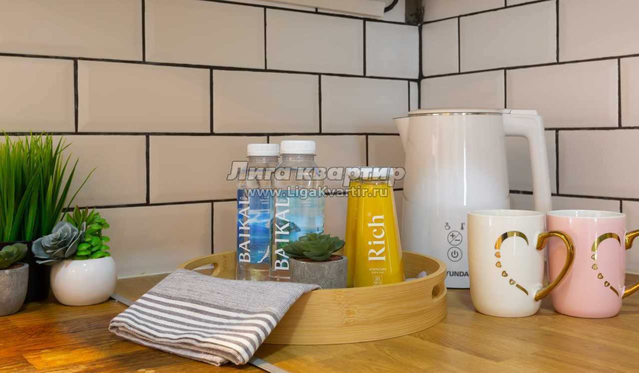 -плита, микроволновка, вытяжка, чайник, холодильник, мини-бар.